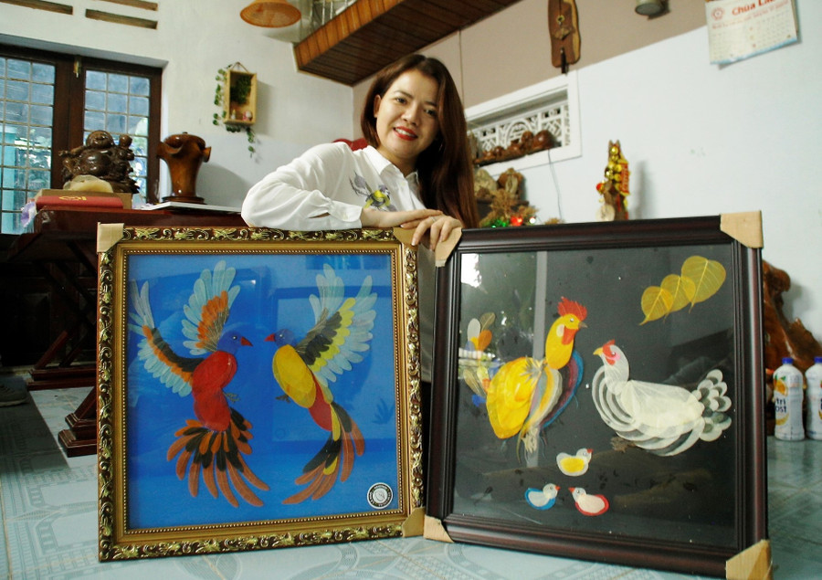 | Chị Sinh thu tiền tỉ mỗi năm qua các tác phẩm làm từ lá. Ảnh: Mạnh Cường |