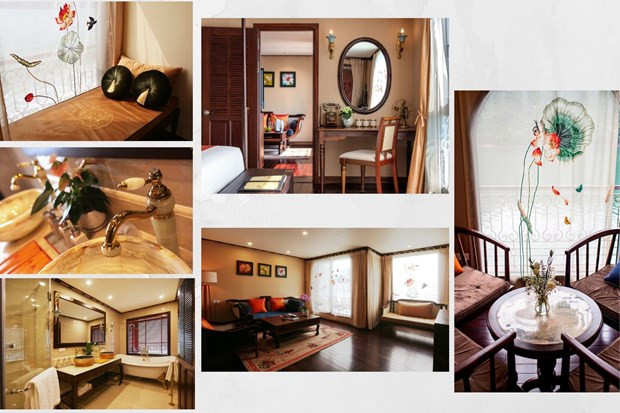 Du khách sẽ ấn tượng bởi cửa sổ vòm châu Âu kết hợp với rèm cửa thêu hoa sen thủ công Việt Nam, bộ sưu tập tranh tư liệu về tiền Đông Dương… Ấn tượng từ những vật dụng sơn mài được bàn tay tài hoa của nghệ nhân làng Hạ Thái khéo léo tạo tác, gốm nạm đồng thiết kế riêng của nghệ nhân Bát Tràng, gỗ khảm sơn mài Đồng Kỵ, lan can hoa văn sơn nhũ đồng…