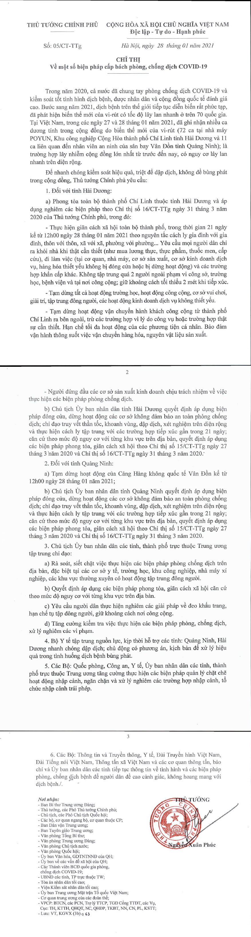 (GLO)- Ngày 28-1, Thủ tướng Chính phủ Nguyễn Xuân Phúc đã có Chỉ thị số 05/CT-TTG về một số biện pháp cấp bách phòng-chống dịch Covid-19.
