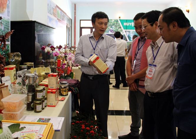 Chủ tịch thị xã Gia Nghĩa Trần Đình Ninh (bên trái ảnh) giới thiệu sản phẩm nông nghiệp của thị xã