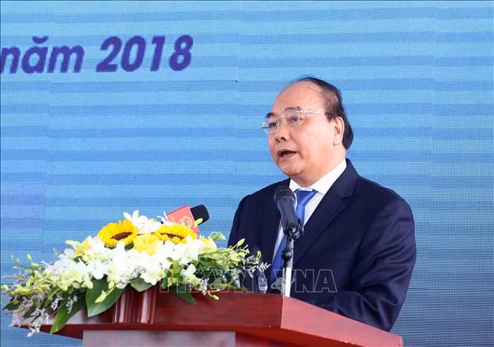 Thủ tướng Nguyễn Xuân Phúc phát biểu tại buổi Lễ khánh thành, thông xe tuyến đường cao tốc Hạ Long - Hải Phòng và Cầu Bạch Đằng. Ảnh:Thống Nhất/TTXVN