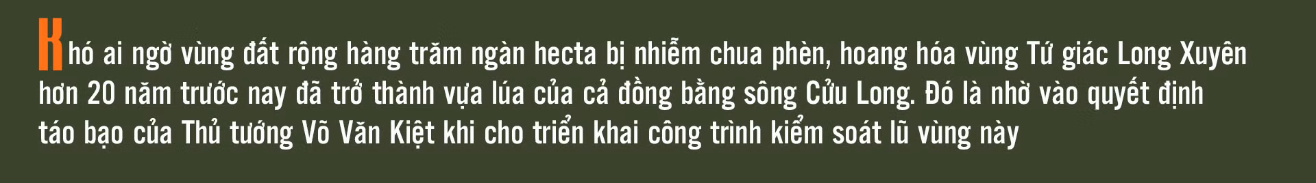 Theo ông Đỗ Minh Trí - Phó Chủ tịch UBND huyện Tri Tôn, tỉnh An Giang - trước năm 1997, vùng Tứ giác Long Xuyên là khu đất trũng, nhiễm phèn nặng, nhiễm mặn cao ở các huyện ven biển Kiên Giang, sản xuất chủ yếu là lúa mùa 1 vụ mỗi năm. Đời sống của nông dân trong vùng vất vả do sản xuất nông nghiệp khó khăn. Những tưởng một diện tích rộng lớn vùng Tứ giác Long Xuyên thuộc các tỉnh An Giang, Kiên Giang và TP Cần Thơ phải chịu cảnh phèn chua, hoang hóa suốt nhiều năm dài thì việc Thủ tướng Võ Văn Kiệt cho đào các tuyến kênh T4, T5, T6 đã làm thay đổi, bật dậy sức sống tiềm năng của vùng đất này.