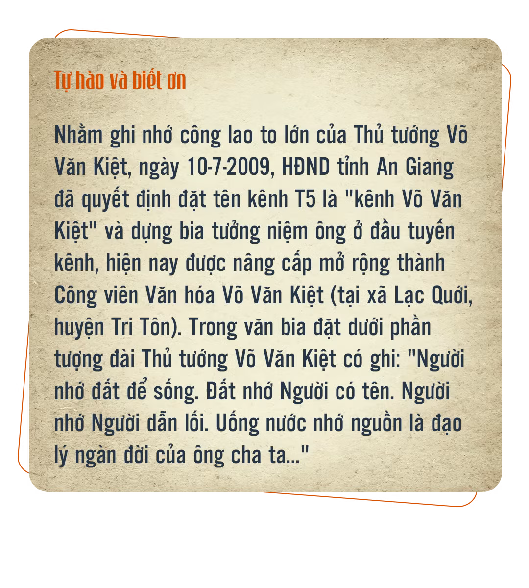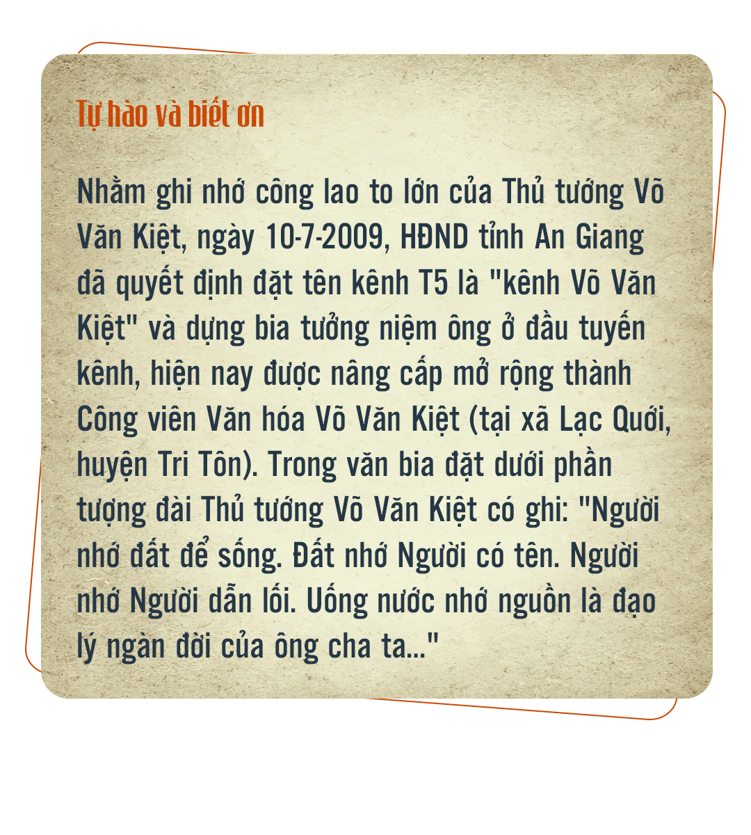 Người dân trong vùng vẫn nhớ như in hình ảnh Thủ tướng Võ Văn Kiệt nhiều lần ghé kiểm tra tiến độ đào kênh. Ông Huỳnh Ngọc Ân, ngụ xã Lạc Quới (huyện Tri Tôn, tỉnh An Giang) cho biết: "Lúc đó, việc đào kênh khẩn trương lắm! Máy xúc làm liên tục, bờ kênh được đắp cao, mưa lầy lội mà Thủ tướng vẫn xắn ống quần đi trên bờ kênh quan sát, đôn đốc việc thi công. Thủ tướng rất giản dị, gần dân. Nhờ tấm lòng của ông mà người dân nơi đây có được những con kênh tháo đất phèn, rước nước ngọt cho ruộng đồng tươi tốt, nên người dân quen gọi kênh T5 là "kênh Ông Kiệt"".
