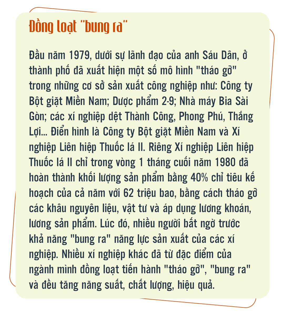 Chính những chủ trương, chính sách do anh Sáu Dân tổ chức nghiên cứu từ thực tiễn TP HCM rồi đưa ra thí điểm, tiến hành tổng kết đã trở thành những bước đột phá, làm căn cứ thực tiễn quan trọng, góp phần hình thành tư duy và đường lối đổi mới sau này của đất nước.