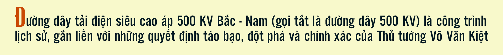 Theo ông Trần Viết Ngãi - nguyên Phó Tổng Giám đốc Tập đoàn Điện lực Việt Nam, nguyên Phó trưởng Ban Chỉ đạo công trình đường dây 500 KV - đường dây 500 KV là công trình mang đậm dấu ấn của Thủ tướng Võ Văn Kiệt. Bởi khi đó, trên thế giới chưa có nước nào làm đường dây truyền tải lớn như vậy, ngay từ ý tưởng đã cho thấy sự táo bạo của người đứng đầu Chính phủ.