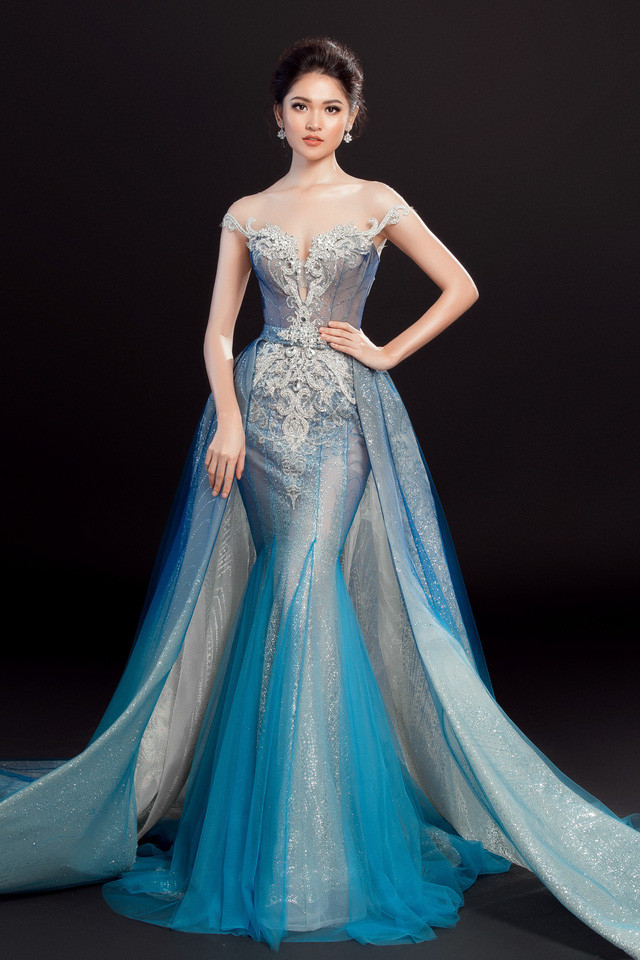 Với lợi thế về vóc dáng mảnh mai, làn da khỏe khoắn, nhà thiết kế Anh Thư chọn màu xanh ombre cho đầm dạ hội này với mong muốn Thùy Dung mang hình ảnh một cô gái nhiệt đới tự tin, duyên dáng đến với bạn bè quốc tế.
