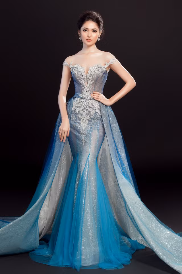 Chọn đầm dạ hội màu xanh ombre, Á hậu Thùy Dung khéo léo khoe đường cong cơ thể bằng thiết kế đuôi cá, tôn đường cong cơ thể. Phần váy choàng phía ngoài giúp Thùy Dung lộng lẫy trong di chuyển nhưng không kém phần sang trọng, tinh tế như một nữ hoàng sắc đẹp.