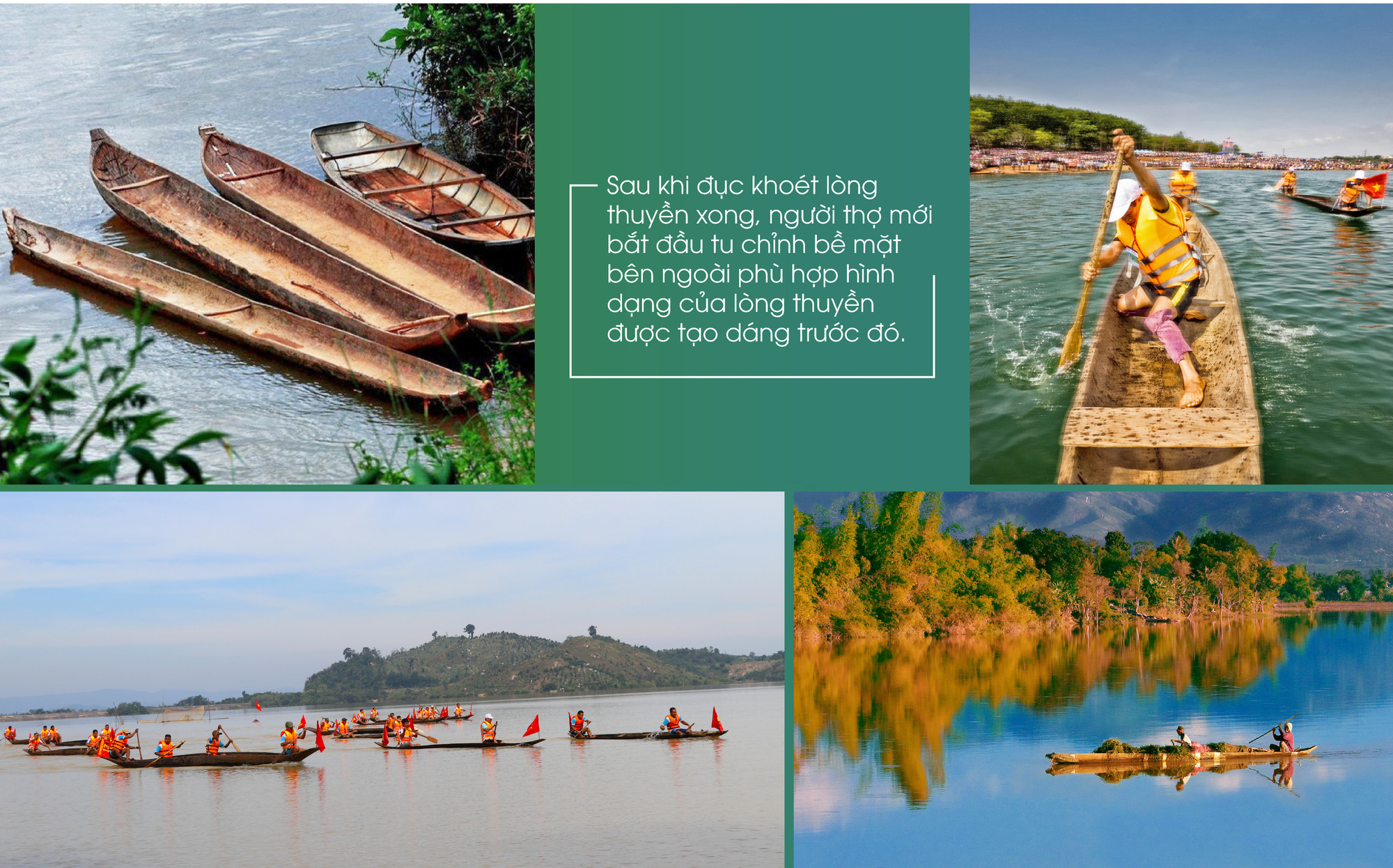 Thuyền được làm ngay tại nơi lấy nguyên liệu. Để thuyền giữ được độ thăng bằng, không bị cong vênh, người thợ phải chọn những khúc gỗ to, thẳng; trong quá trình khoét rỗng lòng thuyền, đẽo mạn thuyền phải tính toán sao cho cân đối để khi xuống nước thuyền không bị nghiêng lệch. Sau đó, lần lượt đẽo từ đuôi thuyền, mũi thuyền rồi chia từng phần nhỏ để khoét lòng thuyền. Việc đẽo, khoét lòng thuyền bằng các dụng cụ đơn giản như rìu, rựa kết hợp giữa đục đẽo với đốt lửa nhằm vừa làm khô bớt lượng nước trong thân gỗ vừa dễ đẽo gọt vừa làm nóng thân gỗ để nong căng mạn thuyền.