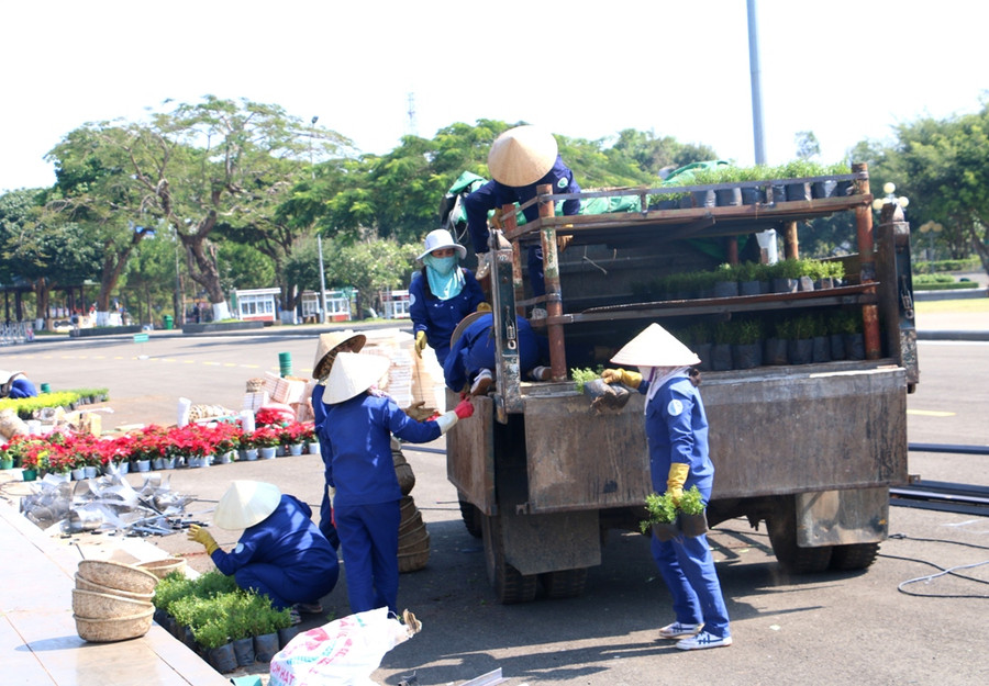 | Lực lượng công nhân của Công ty cổ phần Công trình đô thị Gia Lai đang tích cực sắp xếp hoa. |