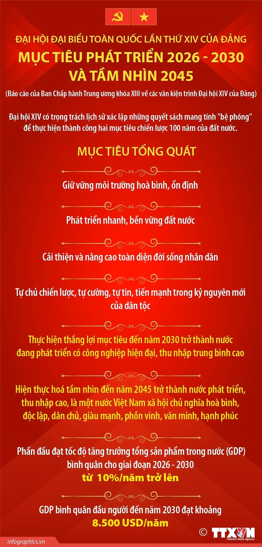Nghị quyết Đại hội XIV đề ra mục tiêu tổng quát cho giai đoạn 2026-2030 và tầm nhìn đến 2045 hết sức rõ ràng, táo bạo nhưng khả thi: giữ vững môi trường hòa bình, ổn định; phát triển đất nước nhanh và bền vững; nâng cao toàn diện đời sống Nhân dân; tăng cường tự chủ, tự cường để tiến mạnh trong kỷ nguyên mới của dân tộc.