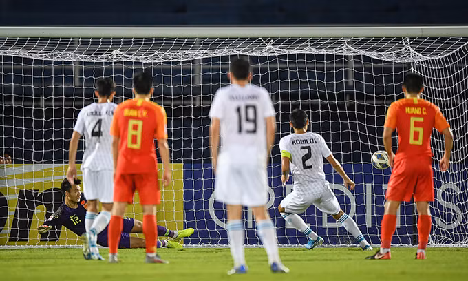Phút 45+2, Bozorov đột phá bên góc trái, buộc Wei Zhen nhoài người xoạc bóng trong cấm địa. Trọng tài thổi phạt hậu vệ U23 Trung Quốc và trao 11m cho U23 Uzbekistan. Trên chấm 11m, đội trưởng Kobilov bình tĩnh đặt lòng vào góc phải, mở tỷ số cho đội bóng Trung Á.