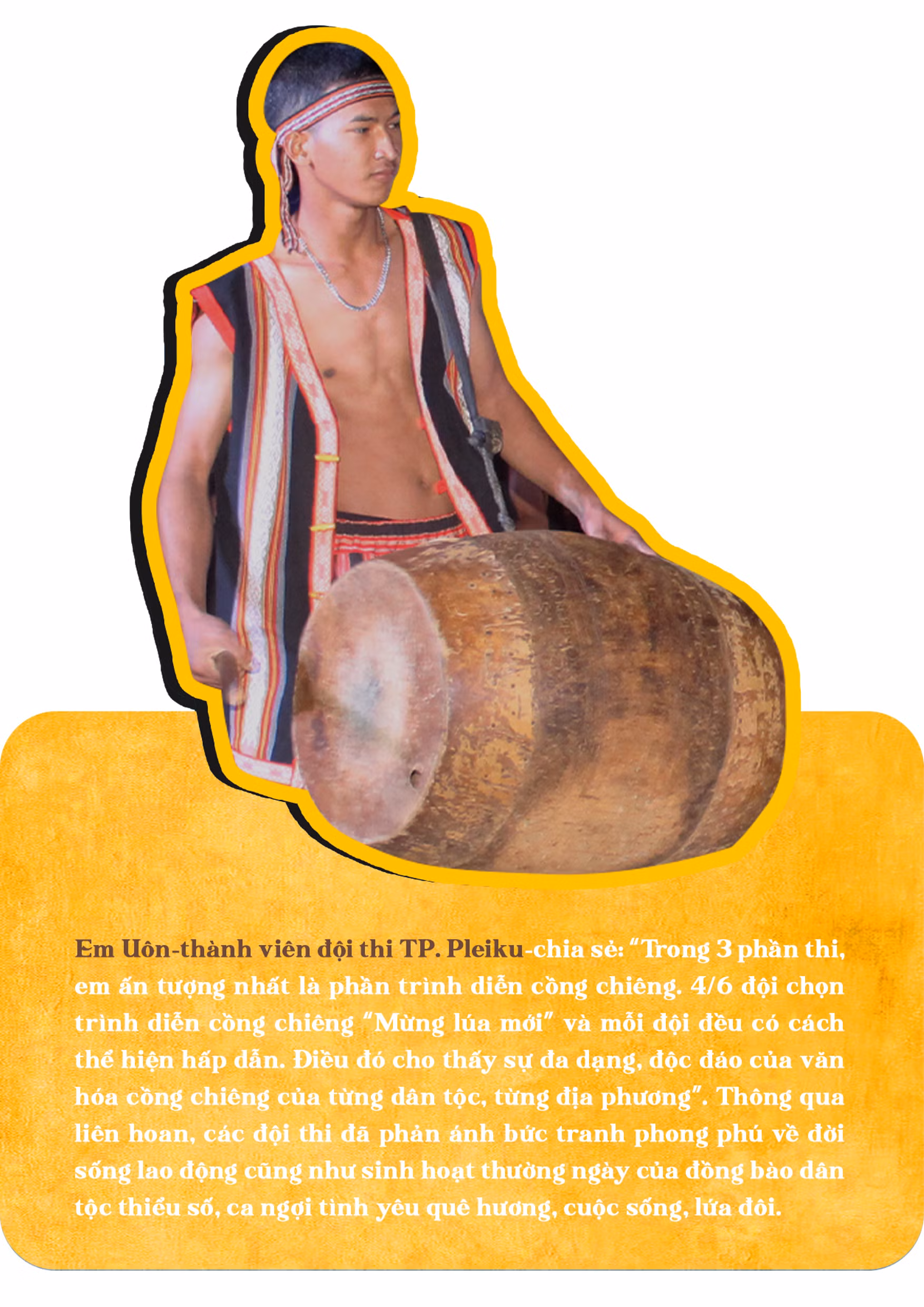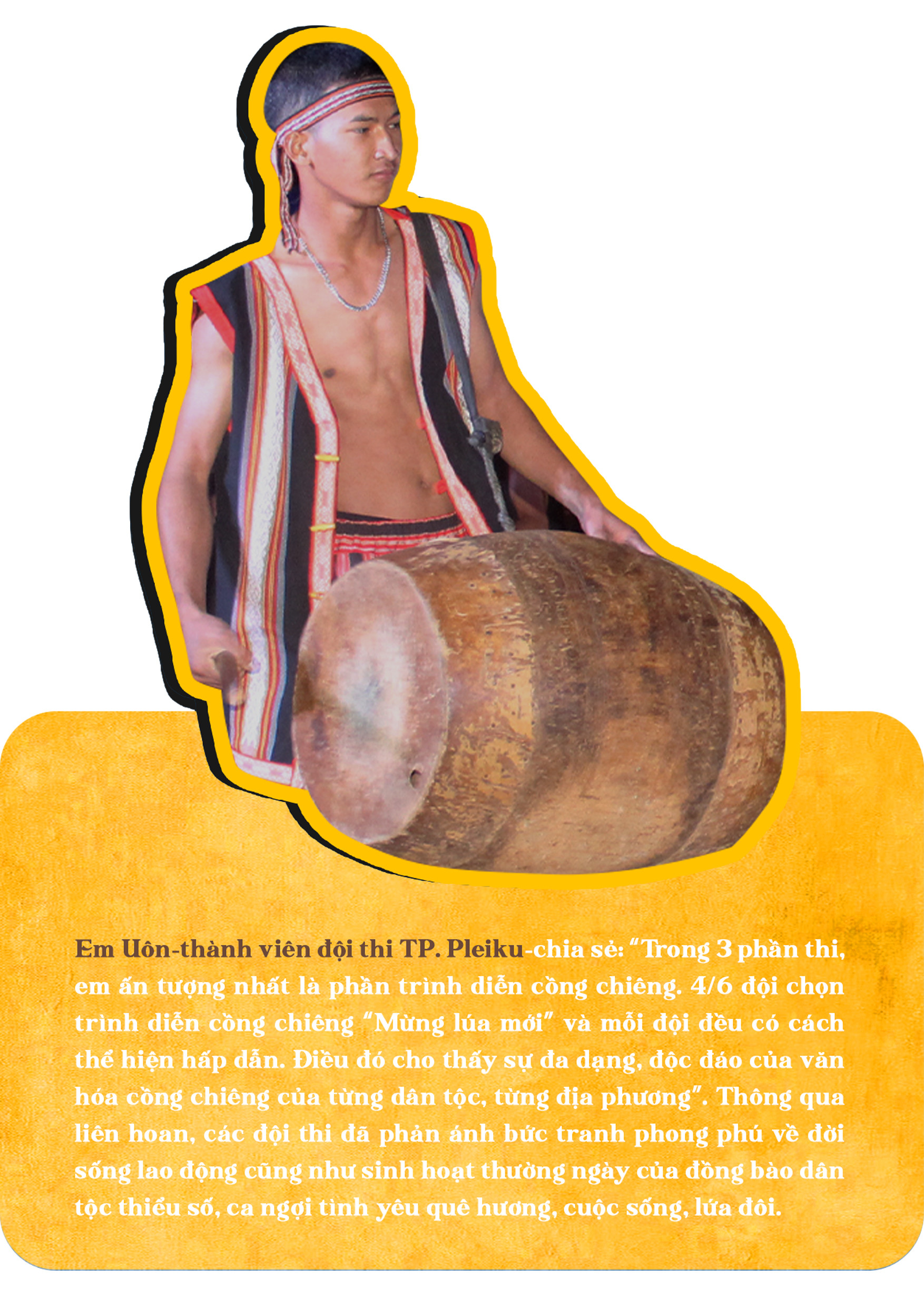 Tạo ấn tượng không chỉ bởi chất lượng của từng tiết mục, liên hoan còn cho thấy sự tiếp nối mạch nguồn truyền thống qua các thế hệ. Nhiều thành viên tuy nhỏ tuổi nhưng trình diễn cồng chiêng thuần thục, điêu luyện thể hiện sự nghiêm túc, tôn trọng và yêu mến văn hóa dân tộc.