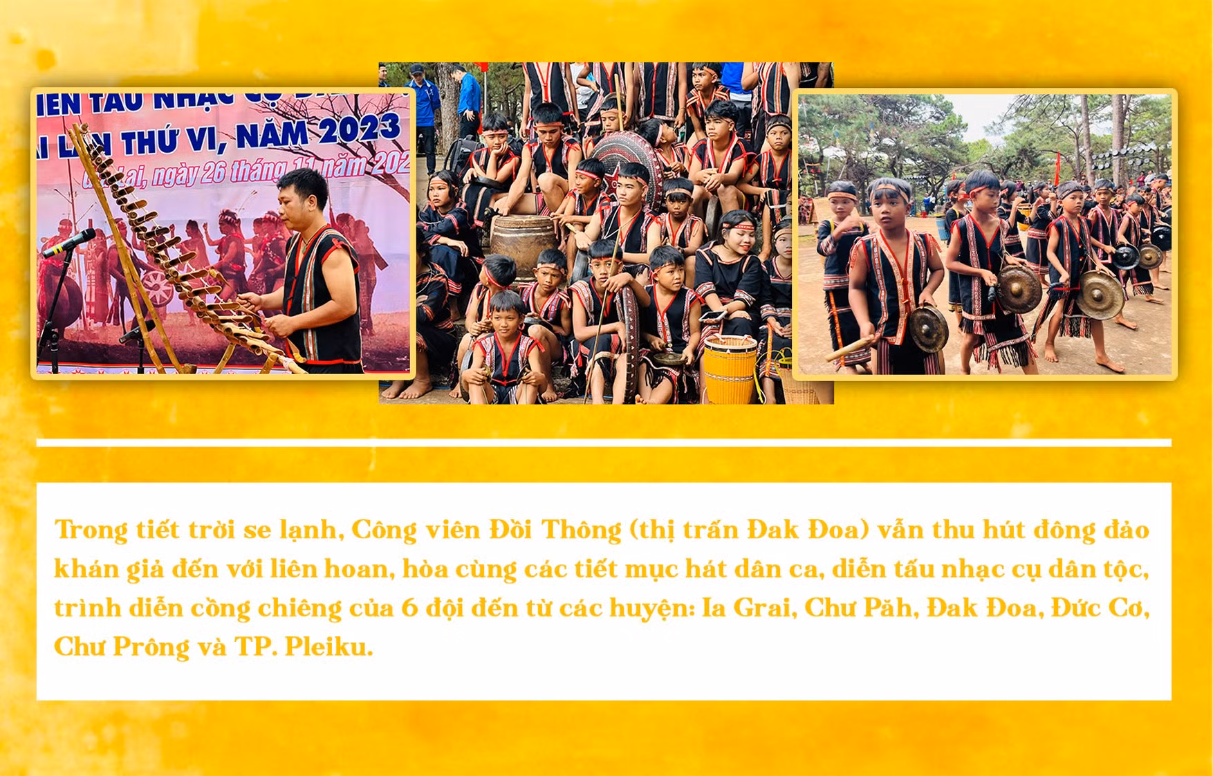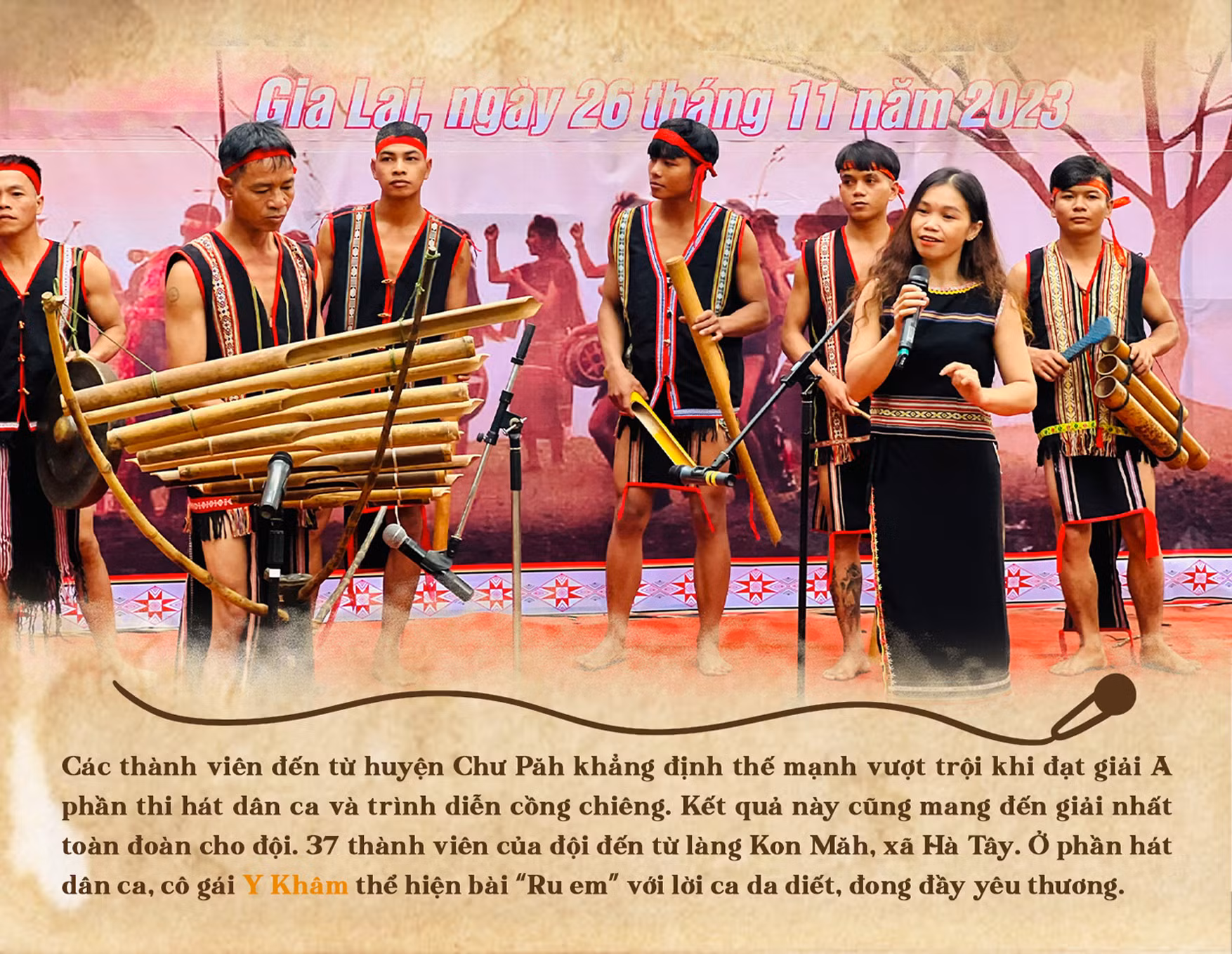 Nếu phần hòa tấu nhạc cụ dân tộc lôi cuốn người xem bởi những thanh âm đặc trưng của trống, chiêng, trưng, đinh pắc pút... thì phần thi hát dân ca lại tạo ấn tượng bởi những giai điệu, lời ca mượt mà, sâu lắng của các chàng trai, cô gái qua các bài như: Ru em, Mừng chiến thắng Đảng ta, Ru con Ơ Vắt Ơ Vông, Ơ mih pơ la… Phần trình diễn cồng chiêng cuốn hút người xem khi tái hiện các lễ hội truyền thống của các dân tộc như: lễ mừng lúa mới, pơ thi…