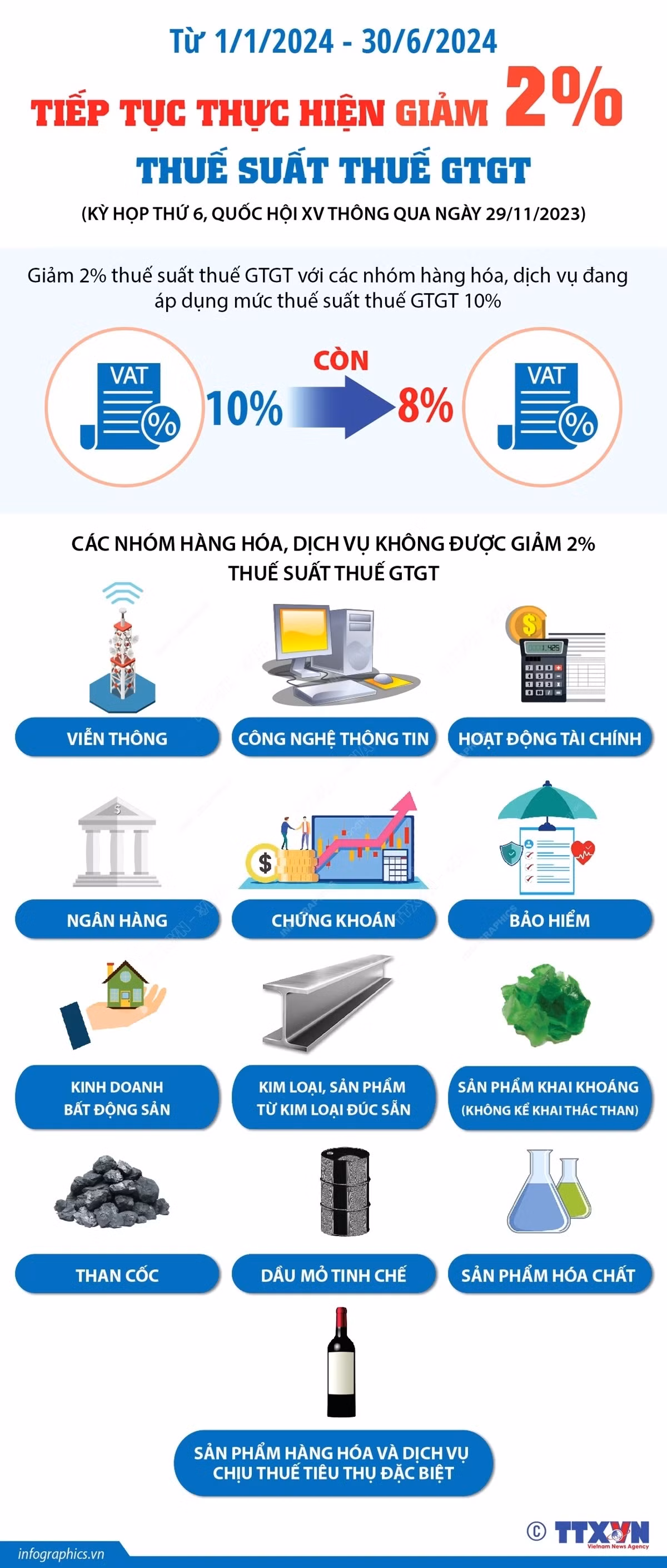 Đáng chú ý, Quốc hội đã đồng ý giảm 2% Thuế Suất Thuế giá trị gia tăng đối với các nhóm hàng hóa, dịch vụ quy định tại điểm a, mục 1.1, khoản 1 Điều 3 của Nghị quyết số 43/2022/QH15 của Quốc hội về chính sách tài khóa, tiền tệ hỗ trợ Chương trình phục hồi và phát triển kinh tế-xã hội trong thời gian từ ngày 1/1/2024 đến hết ngày 30/6/2024.