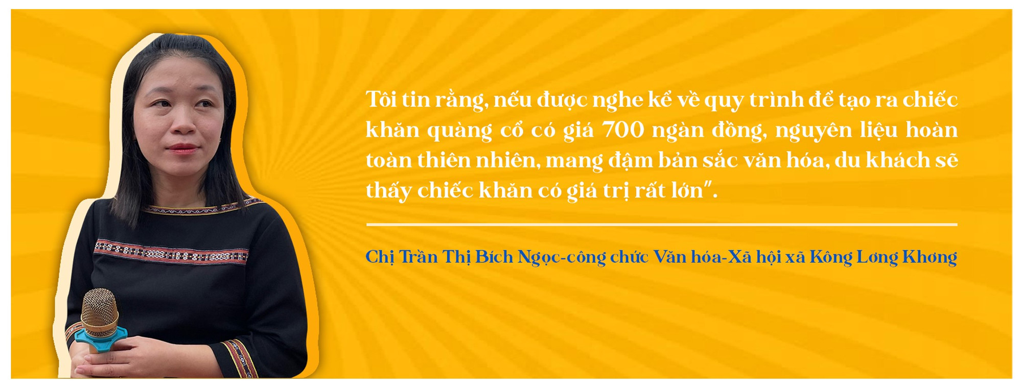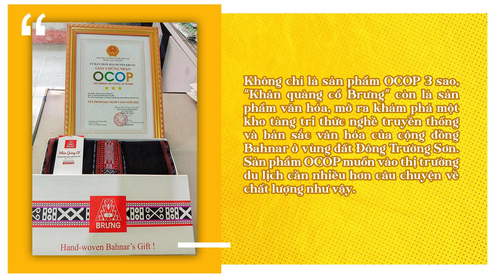 Mới đây, UBND huyện Kbang đã công bố, trao quyết định chứng nhận 11 sản phẩm đạt OCOP 3 sao năm 2023 cho 8 chủ thể, trong đó có “Khăn quàng cổ Brưng” của chị Đinh Thị Hái (làng Kgiang, xã Kông Lơng Khơng). Chị Trần Thị Bích Ngọc-công chức Văn hóa-Xã hội xã Kông Lơng Khơng, người hỗ trợ, hướng dẫn chị Hái xây dựng thương hiệu cho sản phẩm truyền thống này-chia sẻ: “Để làm nên các sản phẩm thổ cẩm truyền thống của người Bahnar, người phụ nữ phải bỏ ra rất nhiều thời gian để thực hiện các công đoạn từ trồng bông, thu hoạch, tách bông, kéo sợi, nhuộm màu, căng chỉ và dệt. Không chỉ chị Hái mà bà con Bahnar ở đây ý thức rất rõ việc lưu giữ các giá trị văn hóa để khai thác du lịch trong bối cảnh hiện nay. Nhưng họ chưa biết cách tái hiện câu chuyện để tăng sức hấp dẫn cho nghề truyền thống.