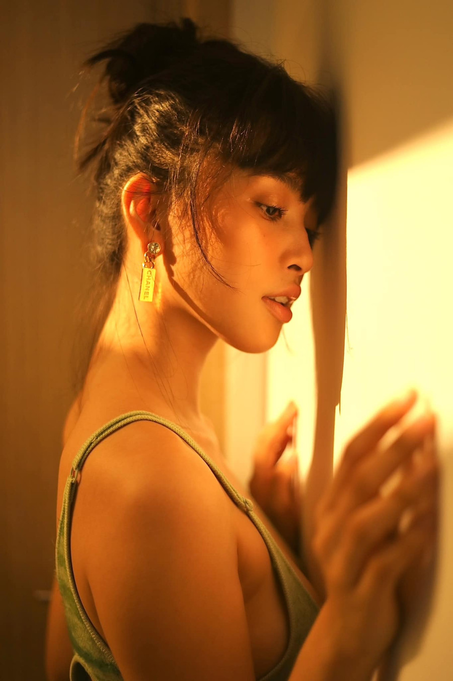 | Mẫu váy hai dây gợi cảm với những khoảng cut out sau lưng, được Tiểu Vy phối cùng bông tai Chanel và tóc buộc gọn cao. |