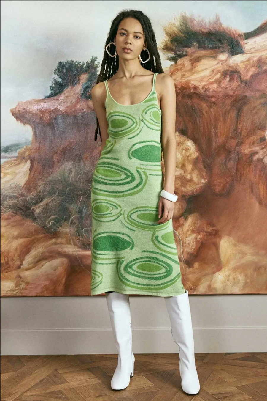 Chiếc váy dệt kim màu xanh lá với các vệt in xoáy nước từng gây bão trong mùa hè của siêu mẫu Kendall Jenner vừa được Hoa hậu Tiểu Vy chưng diện.