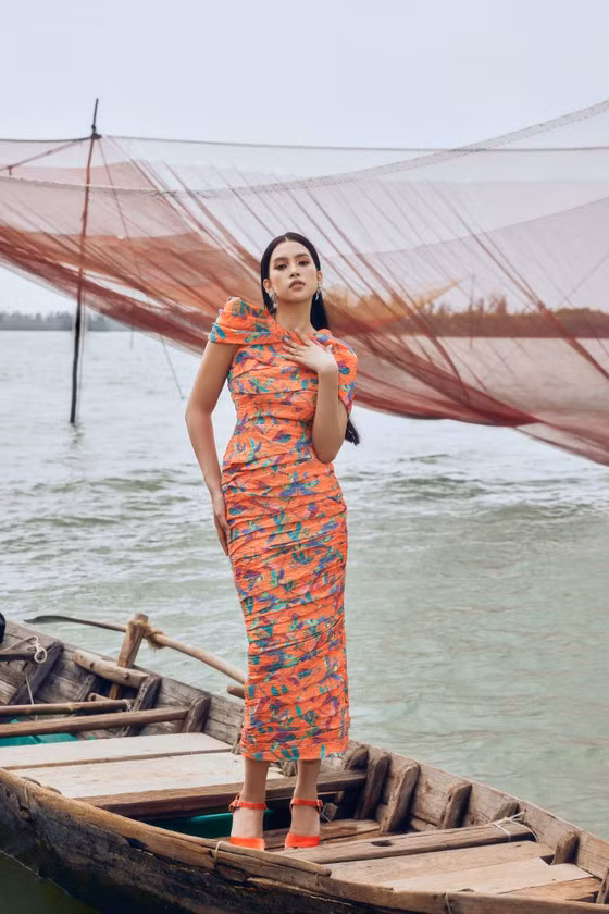 Thời niên thiếu ở phố Hội cổ kính cũng giúp Tiểu Vy có một góc nhìn rất khác về vùng đất này. Cô thể hiện tinh thần trong từng shoot hình thời trang, khi bồng bềnh như tơ lụa trên sông nước Hội An, khi uyển chuyển duyên dáng với vạt áo mỏng manh organza, lúc lại là cô gái mộng mơ cá tính trên cánh đồng lúa xanh bình yên. Sắc cam là màu sắc xuyên suốt trong bộ hình như thông điệp sống lạc quan và mạnh mẽ.