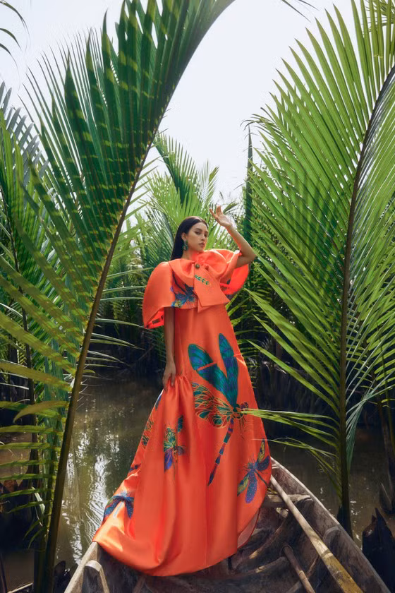 Họa tiết chủ đạo trong bộ sưu tập này là chuồn chuồn sắc màu được cách điệu bắt mắt trên sắc cam tươi mát.