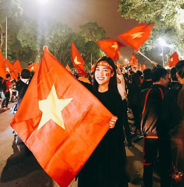 | Đỗ Mỹ Linh cầm cờ tổ quốc, đeo băng rôn cổ vũ cho U23 Việt Nam trong trận bán kết chiều qua tại Hà Nội. |
