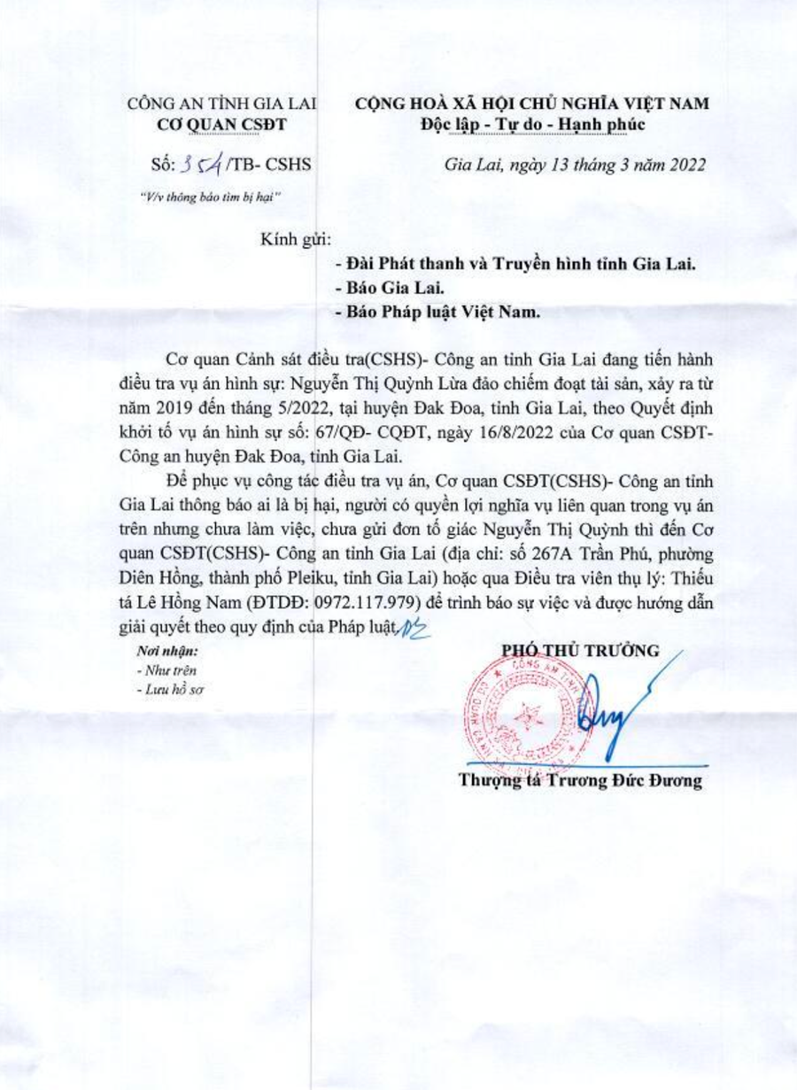 Để phục vụ công tác điều tra vụ án, Cơ quan CSĐT-Công an tỉnh Gia Lai thông báo ai là bị hại, người có quyền lợi nghĩa vụ liên quan trong vụ án trên nhưng chưa làm việc, chưa gửi đơn tố giác Nguyễn Thị Quỳnh thì đến Cơ quan CSĐT (địa chỉ số 267A Trần Phú, phường Diên Hồng, TP. Pleiku, tỉnh Gia Lai) hoặc qua Điều tra viên thụ lý Thiếu tá Lê Hồng Nam (ĐT: 0972.117.979) để trình báo sự việc và được hướng dẫn giải quyết theo quy định của pháp luật.
