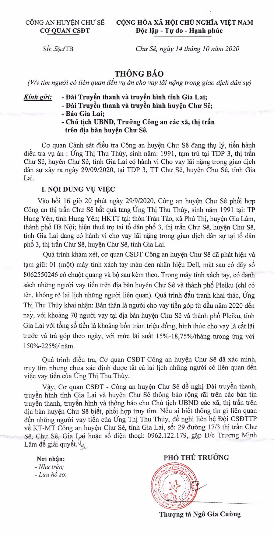 (GLO)- Cơ quan Cảnh sát điều tra Công an huyện Chư Sê thông báo tìm người có liên quan đến vụ án Ứng Thị Thu Thủy có hành vi cho vay lãi nặng trong giao dịch dân sự.