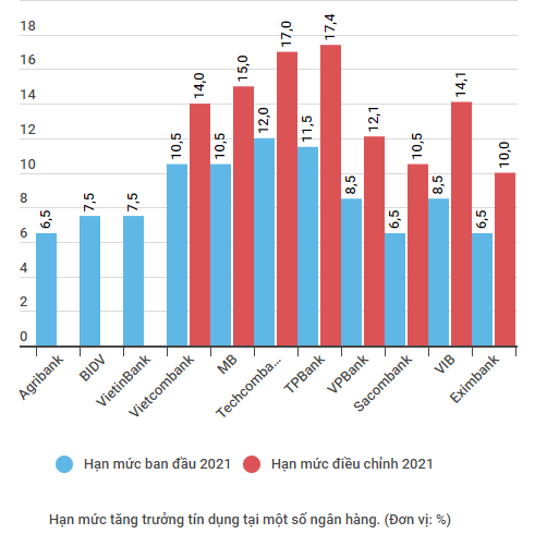 Tiếp đến Ngân hàng Thương mại cổ phần Quốc tế (VIB) từ 8,5% lên 14,1%, Ngân hàng Thương mại cổ phần Việt Nam Thịnh vượng (VPBank) được điều chỉnh từ 8,5% lên 12,1%, Ngân hàng Thương mại cổ phần Sài Gòn Thương tín (Sacombank) được nới room tín dụng từ 6,5% lên 10,5%, Ngân hàng Thương mại cổ phần Xuất nhập khẩu Việt Nam (Eximbank) được nâng chỉ tiêu tín dụng từ 6,5% lên 10%.