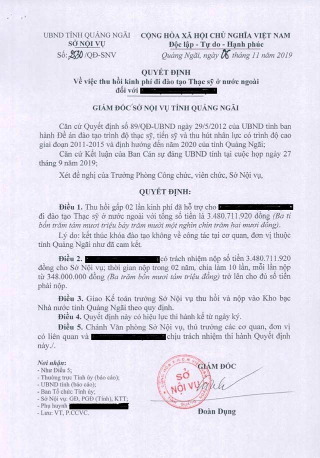 Trong 4 quyết định yêu cầu bồi hoàn mà Sở Nội vụ Quảng Ngãi đã ban hành vào ngày 6/11/2019, trường hợp phải bồi hoàn nhiều nhất là gần 3,5 tỷ đồng và ít nhất là khoảng 2 tỷ đồng.