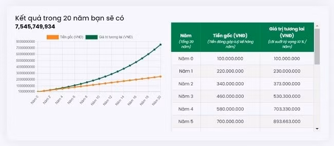 Công cụ này không chỉ đưa ra số tiền lãi mà bạn nhận được mà còn được thể hiện dưới dạng biểu đồ một cách trực quan để bạn tham khảo. Đường màu xanh biểu diễn số tiền tích lũy được theo thời gian, trong khi đường màu cam biểu diễn số tiền vốn bỏ ra. Điều này giúp bạn dễ dàng so sánh và đánh giá hiệu quả của việc đầu tư.