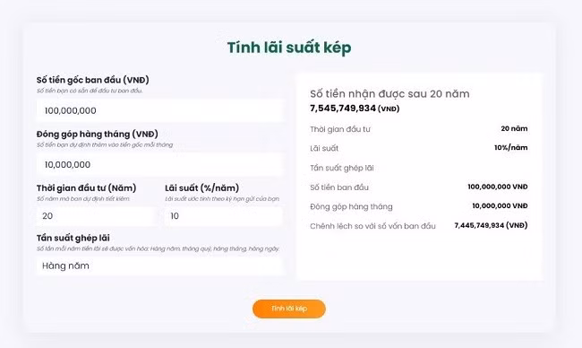 Truy cập công cụ tính lãi kép của Fingo: https://fingo.vn/cong-cu/tinh-lai-kep