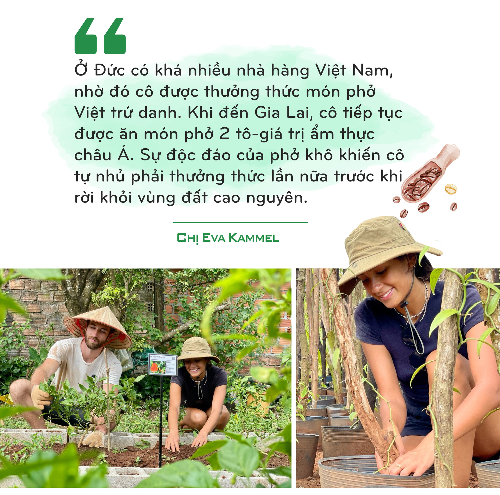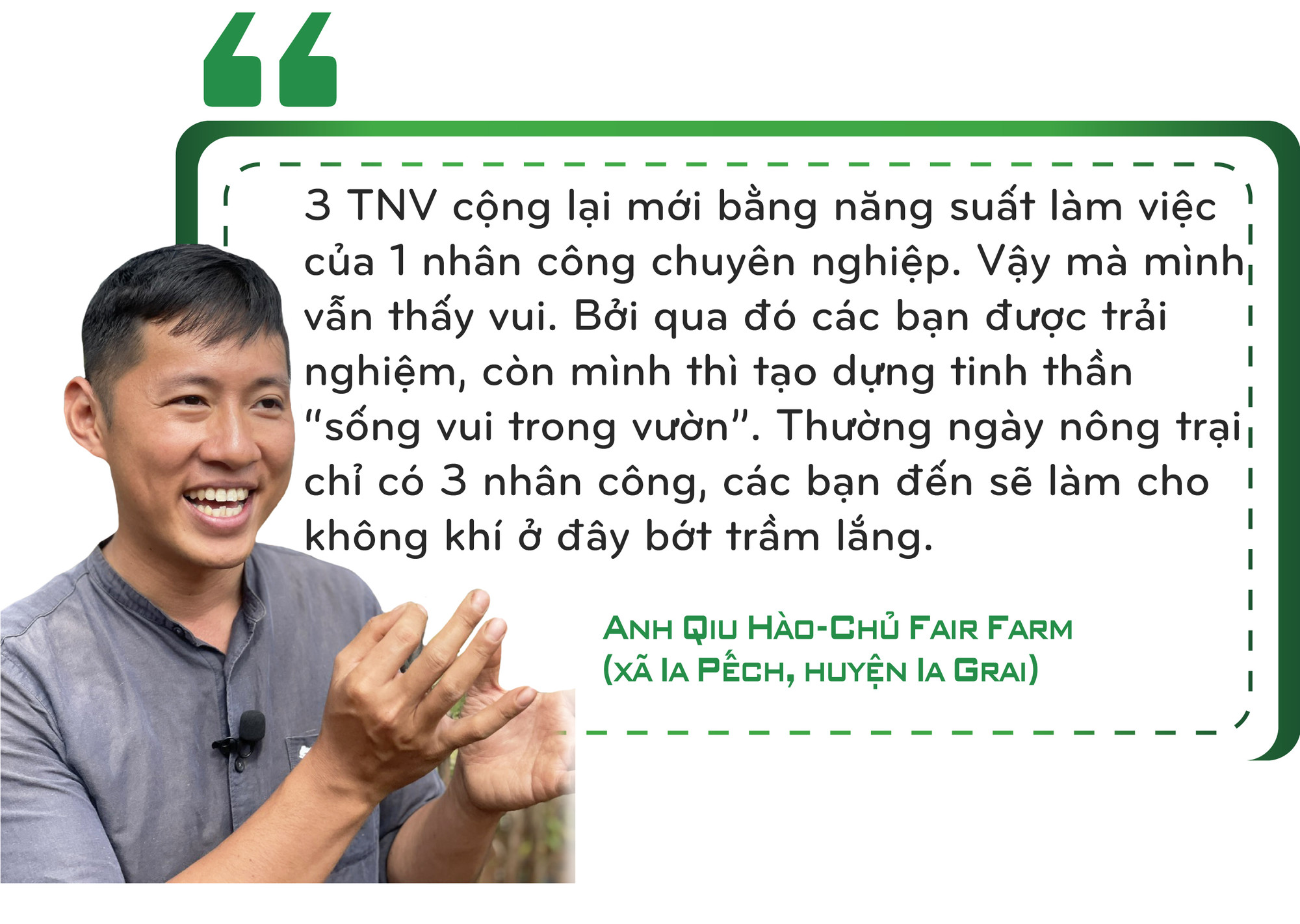 Từ chỗ là đơn vị tiên phong tuyển TNV làm nông nghiệp tại Gia Lai, Moon’s Coffee Farm lan tỏa mô hình đến những người cùng ý hướng làm nông nghiệp bền vững, trong đó có Fair Farm (xã Ia Pếch, huyện Ia Grai). Anh Qiu Hào-Chủ Fair Farm-cho biết, nông trại bắt đầu nhận TNV từ hơn 1 tháng qua. Có cha là người Hoa, mẹ người Việt, bản thân mang quốc tịch Đức do sinh ra và lớn lên ở đó, anh Hào càng có điều kiện thuận lợi khi tiếp đón TNV quốc tế nhờ sử dụng lưu loát nhiều ngôn ngữ. Anh Hào cho hay, nông trại của anh rộng hơn 7 ha, chuyên trồng sầu riêng, bơ, cà phê... Mang tình yêu đặc biệt với nông nghiệp, anh còn ươm trồng nhiều loại cây giống khác. Hiện tại, ở Fair Farm đang có 4 TVN nước ngoài, hàng ngày phân công nhau đảm trách nấu ăn, chăm sóc vườn rau nội bộ, vườn ươm. Anh Hào là người “cầm tay chỉ việc” trong cách thức tỉa cành, chiết cành, kỹ thuật chăm cây hoặc cách xử lý khi cây trồng bị rệp, ốc sên phá hại.