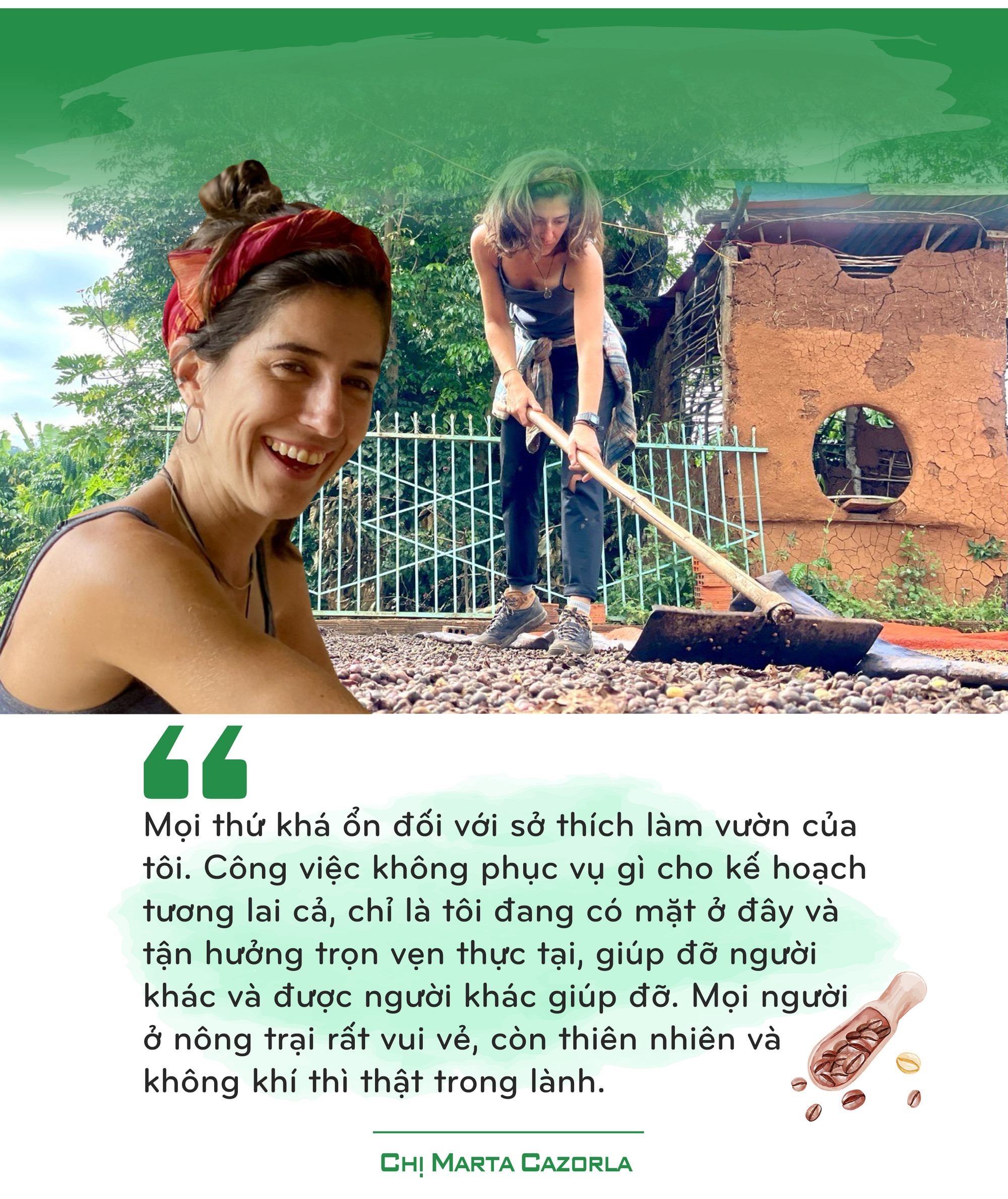 Từ khi đặt chân đến Moon’s Coffee Farm, cứ 7 giờ sáng là chị Marta Cazorla (29 tuổi, đến từ Tây Ban Nha) thức dậy, cùng các TNV nấu bữa sáng, ăn sáng, thưởng thức ly cà phê đầu ngày và bắt tay làm việc lúc 8 giờ. Trong 1 tuần lưu lại nông trại này, Marta học cách hái cà phê, sơ chế, phơi giàn, đảo cà phê, đóng bao... Nhìn cách chị trải nghiệm quá trình lao động chân tay tất bật, vất vả như một nông dân chính hiệu trong cái nắng nóng đến khô người, chúng tôi ngầm thán phục. Càng bất ngờ hơn khi biết Marta không xuất thân từ nhà nông. Chị hiện là Tiến sĩ ngành Năng lượng tái tạo và Khoa học.