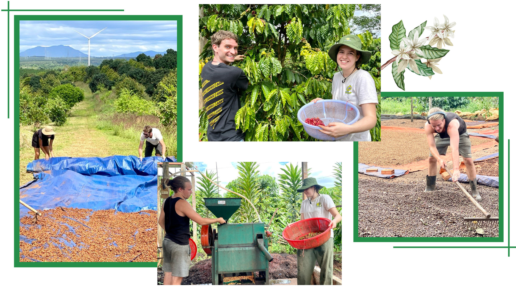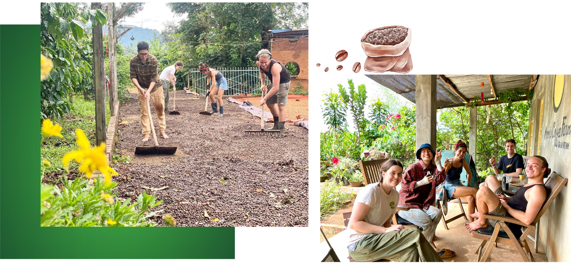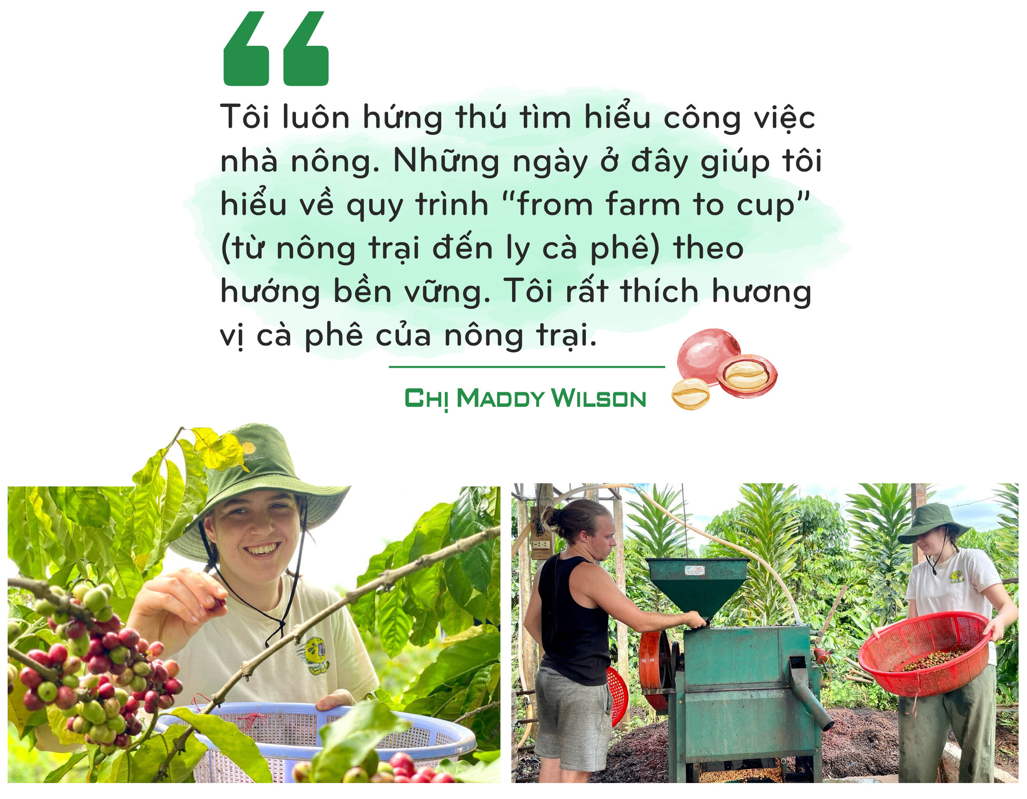 Điểm chung của các TNV tại Moon’s Coffee Farm là đều trẻ tuổi, mong muốn trải nghiệm ở những môi trường khác nhau để phát triển bản thân. Maddy Wilson, cô gái 25 tuổi đến từ Anh là một trong số đó. Trước khi thử làm một nông dân chân lấm tay bùn, cô làm việc cho 1 quỹ từ thiện chuyên đề xuất tài trợ cho những bệnh nhân ung thư ở xứ sở sương mù. Ngưng tay vài phút khi đang đảo cà phê nhân trên giàn phơi, cô gái thắt đôi bím tóc nâu xinh xắn hào hứng kể: Cô biết đến Việt Nam và chiến tranh Việt Nam qua những tiết học lịch sử ở trường. Những tò mò về đất nước nhỏ bé này càng lớn dần lên khi bạn bè chia sẻ trải nghiệm thú vị về du lịch Việt Nam, khiến Maddy mong muốn được một lần đến.