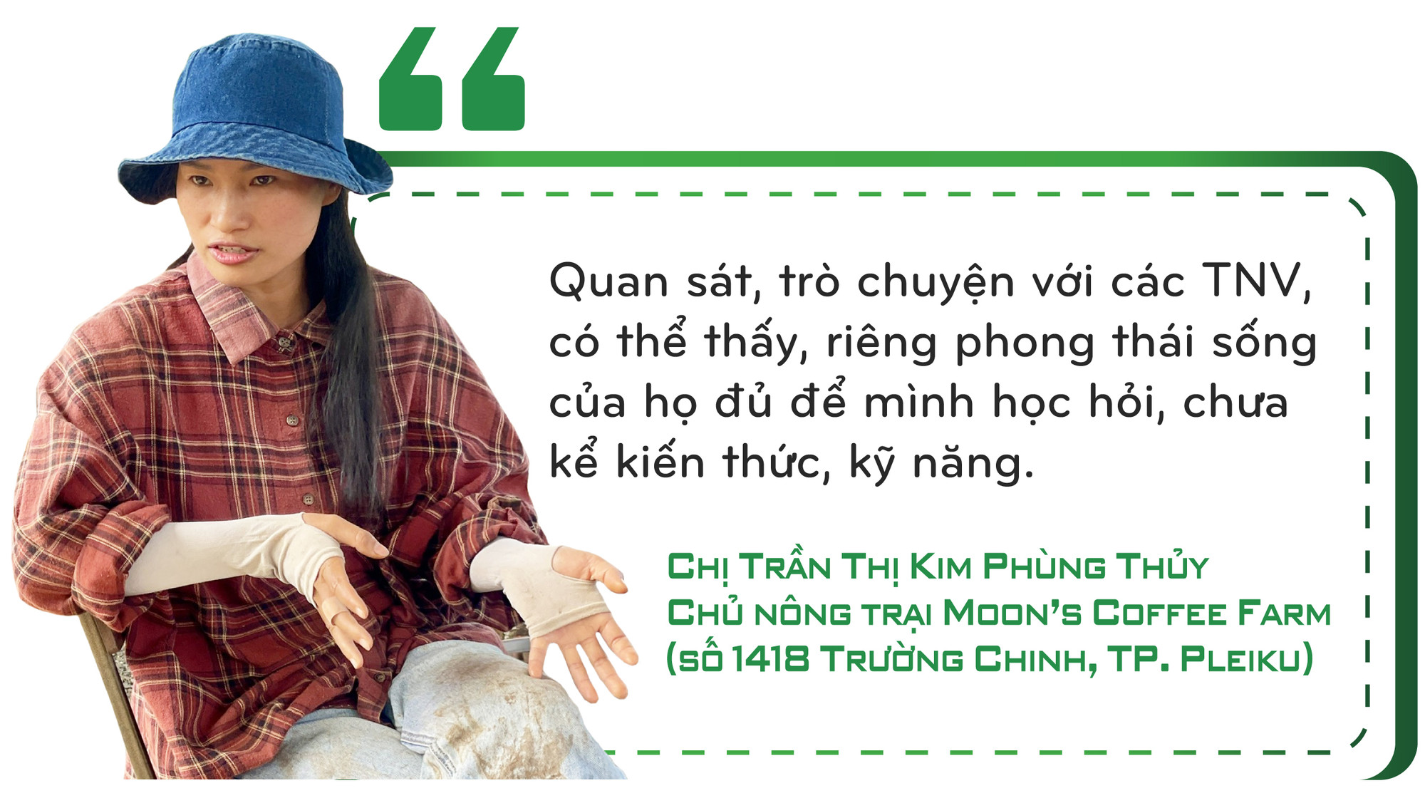 Trong khi các TNV nước ngoài đang cần mẫn đảo cà phê trên khoảng sân rộng, Kim Phùng Thủy tranh thủ trò chuyện. Đây đúng là kỳ vọng của Thủy khi đưa vào vận hành dự án “TNV trao đổi giá trị” từ tháng 9-2021 tại nông trại cà phê có diện tích khoảng 1 ha.