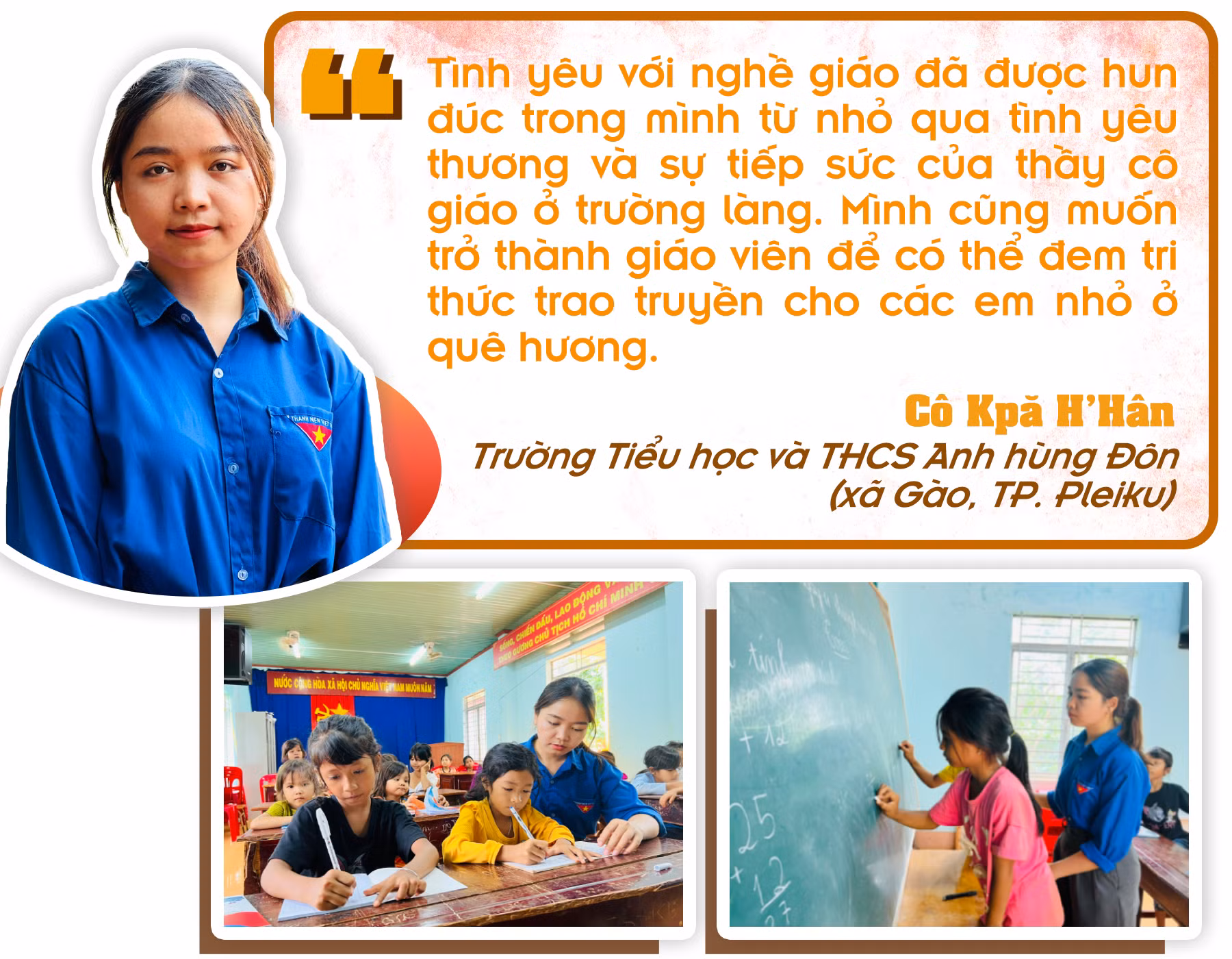 Tốt nghiệp đại học năm 2022, cô giáo trẻ người Jrai trở về quê nhà và được nhận vào giảng dạy tại Trường Tiểu học Nguyễn Khuyến (xã An Phú, TP. Pleiku). Năm học 2024-2025 này, H’Hân xin chuyển công tác về Trường Tiểu học và THCS Anh hùng Đôn (xã Gào, TP. Pleiku) để được gần hơn với học sinh DTTS. Với lợi thế của mình, H’Hân sử dụng linh hoạt tiếng Việt và tiếng Jrai trong quá trình giảng dạy để giúp các em dễ dàng tiếp cận kiến thức.