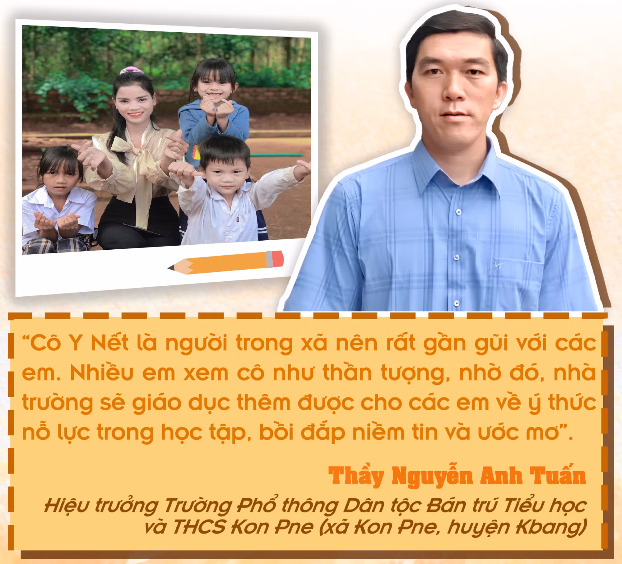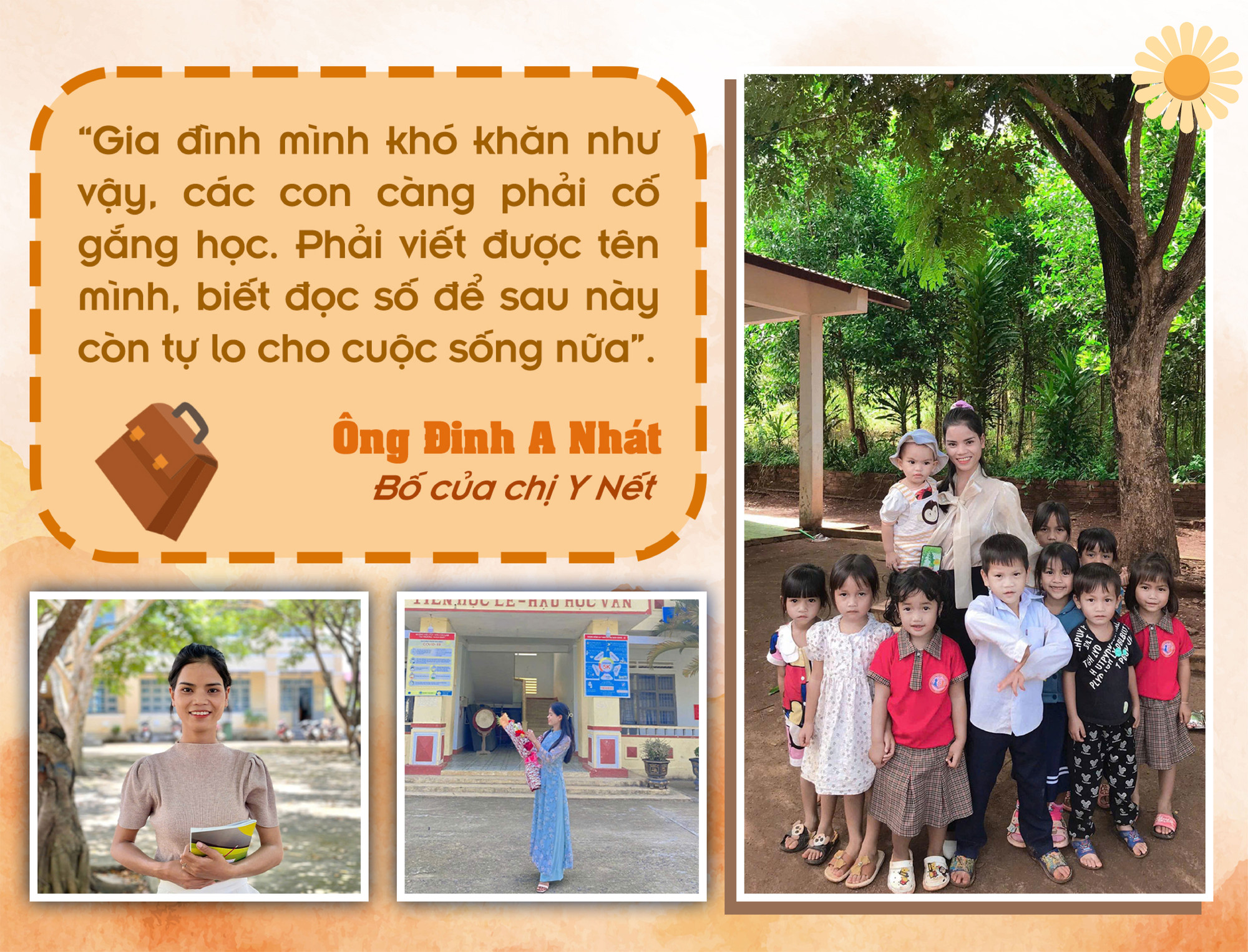 Biết cô Nết là người đầu tiên ở Kon Pne tốt nghiệp đại học, các em tò mò: “Cô ơi, ngày trước cô học ở đâu? Ngoài đó có gì vui?”. Bằng cách nhẹ nhàng giải đáp những câu hỏi ấy, Y Nết đã mở ra cho học trò một khung trời mơ ước bên kia núi Kon Hleng.