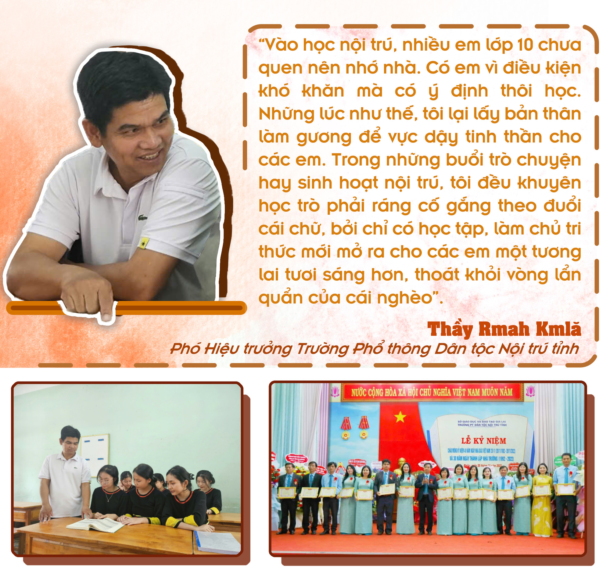 Gắn bó nhiều năm với ngôi trường chuyên biệt của tỉnh, thầy Kmlă bày tỏ niềm hạnh phúc khi bản thân đã góp sức vào hành trình “thắp lửa” tri thức cho học trò. Hơn 10 năm liên tiếp, 100% học sinh lớp 12 của trường đều đậu tốt nghiệp THPT; nhiều em đã và đang theo học tại các trường đại học tốp đầu cả nước.