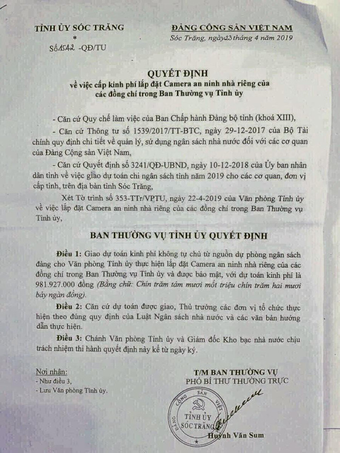 Ông Sum cho biết, việc lắp camera xuất phát theo yêu cầu đề xuất của Công an tỉnh nhằm để bảo vệ mục tiêu, trong đó có nhà riêng của lãnh đạo. Ngày 24/4/2019, Tỉnh ủy Sóc Trăng có Quyết định số 1542 về việc triển khai lắp đặt hệ thống camera an ninh tại nhà riêng của các đồng chí trong Ban Thường vụ Tỉnh ủy.