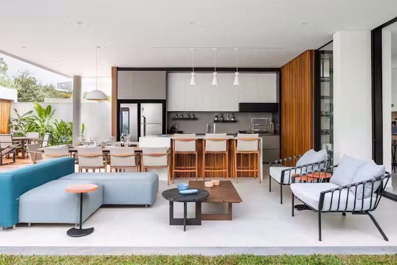 Bản thiết kế nhà hình chữ L cho phép không gian sinh hoạt chung mở rộng liền mạch ra hiên ngoài trời, nơi có khu vực bếp nướng và hồ bơi. Việc bố trí hồ bơi ở cuối khu đất cùng hệ kết cấu không cột đã giúp tạo nên sự liền mạch giữa trong và ngoài, mang lại cảm giác nhẹ nhàng, dễ chịu và thân thiện cho gia chủ. Để tăng cường khả năng kết nối giữa các không gian, vật liệu kính đã được tận dụng triệt để. Ở tầng trệt, các khu vực chức năng đều hiện ra trong tầm mắt, đặc biệt là khu bếp được thiết kế như "trái tim" của ngôi nhà. Tại đây, một khung cửa mở phía sau giúp không gian này đóng vai trò cầu nối linh hoạt giữa nội thất và khu vực ngoài trời. Một điểm thú vị khác là việc sử dụng các cánh cửa ẩn được tích hợp cùng tấm ốp gỗ tạo nên vẻ tối giản, tinh gọn.