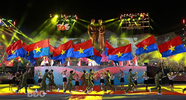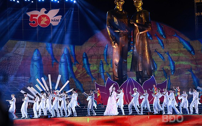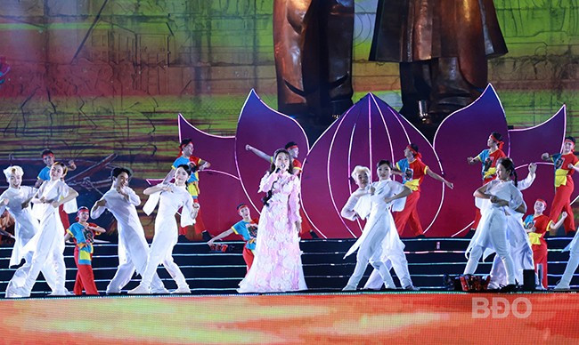 | Chương trình nghệ thuật sử thi với chủ đề “Bình Định - Tự hào và khát vọng”, với 3 chương: Khúc tráng ca hào hùng; 50 năm đổi mới và phát triển; khát vọng miền đất Võ. Chương trình nghệ thuật tái hiện một cách đậm nét về Bình Định - vùng đất địa linh nhân kiệt với lịch sử hàng nghìn năm phát triển, sự tiếp nối mạch nguồn yêu nước hào hùng vượt qua những cuộc chiến tranh cách mạng, cho đến chặng đường đổi mới, xây dựng và phát triển quê hương. Ảnh: NGUYỄN DŨNG |