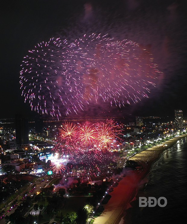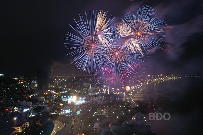 | Màn bắn pháo hoa kết thúc Chương trình nghệ thuật kỷ niệm 50 năm Ngày giải phóng tỉnh Bình Định. Ảnh: NGUYỄN DŨNG |