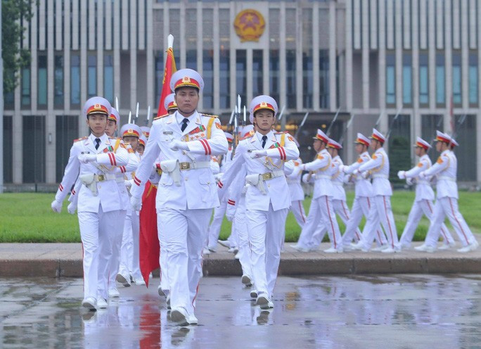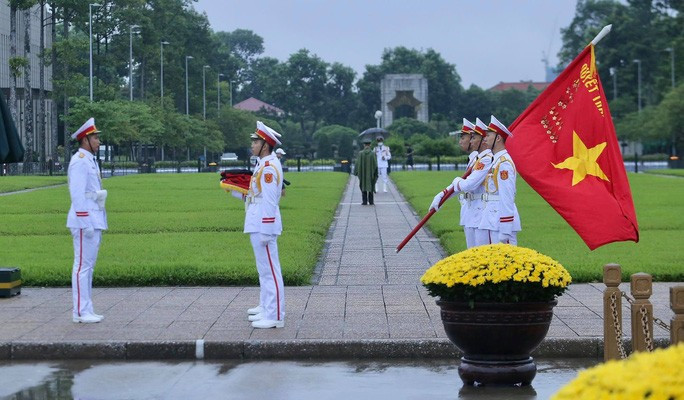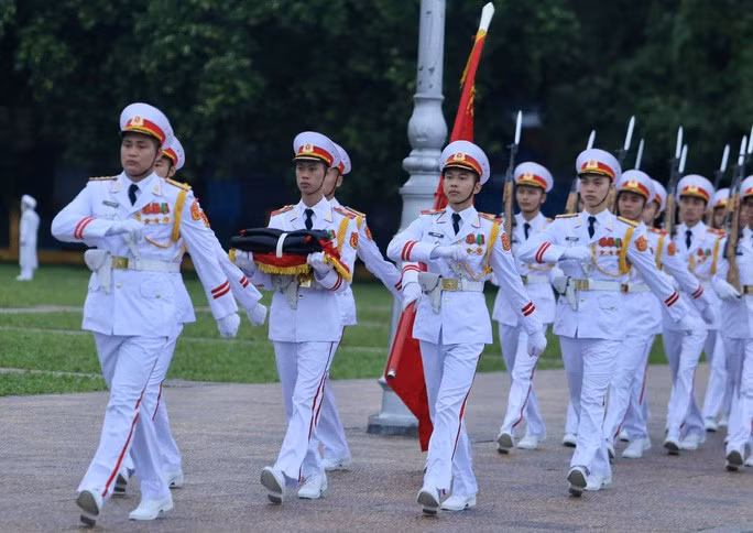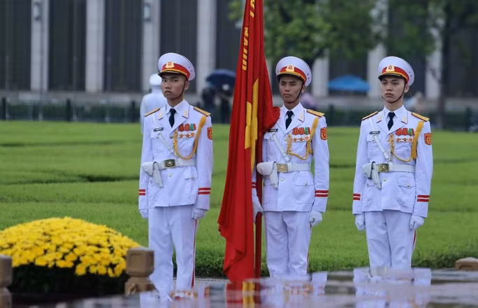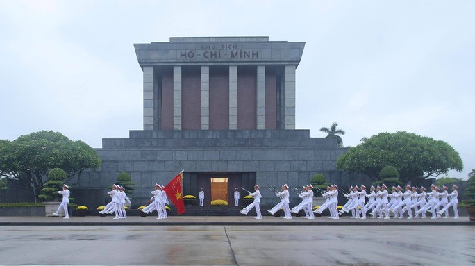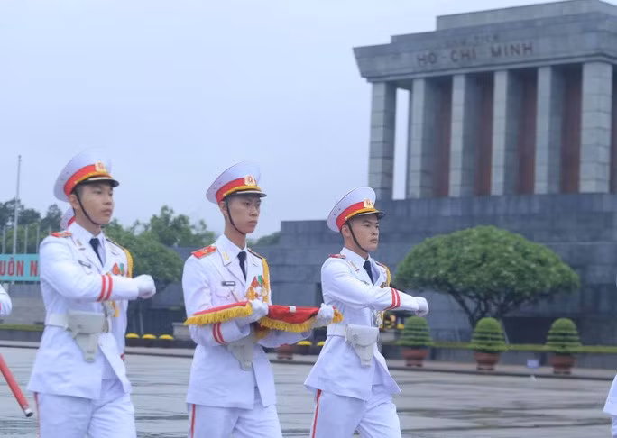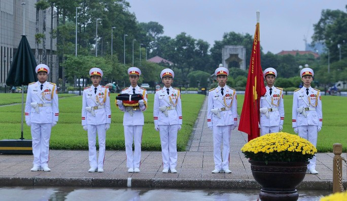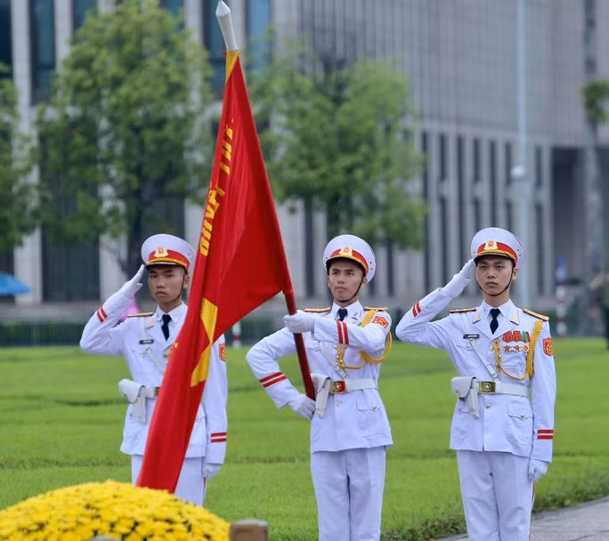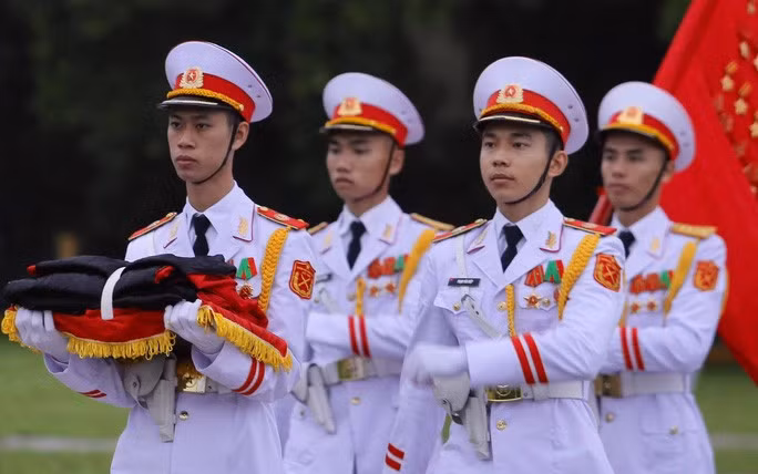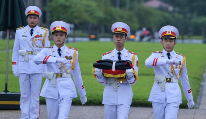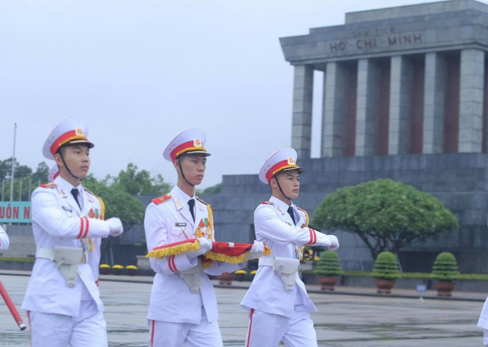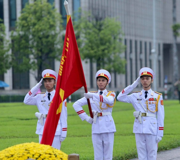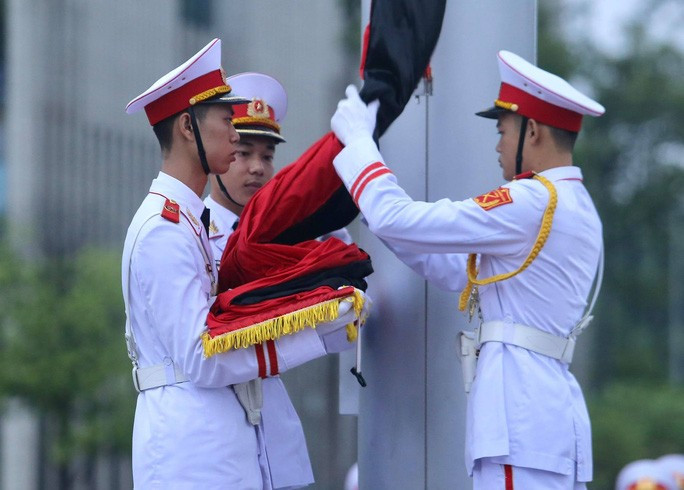 Đội tiêu binh Bộ Tư lệnh bảo vệ Lăng Chủ tịch Hồ Chí Minh mang theo lá cờ được gắn dải băng tang.