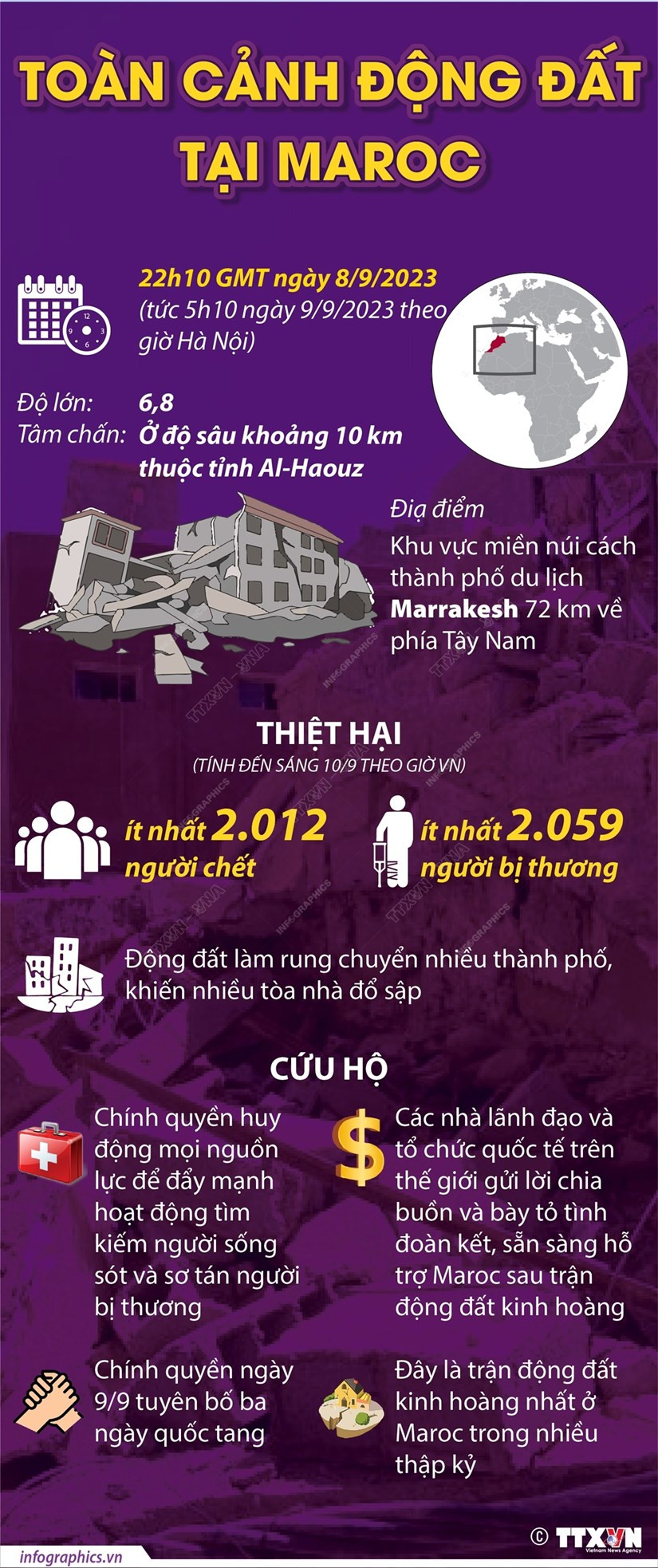Thống kê mới nhất từ Bộ Nội vụ Maroc ngày 9/9 cho biết trận động đất nghiêm trọng xảy ra ở nước này đã khiến hơn 2.000 người thiệt mạng và ít nhất 2.000 người khác bị thương, nhiều người trong số đó đang nguy kịch.