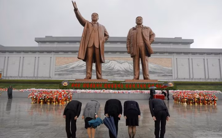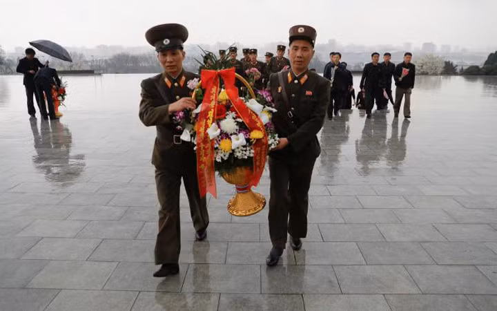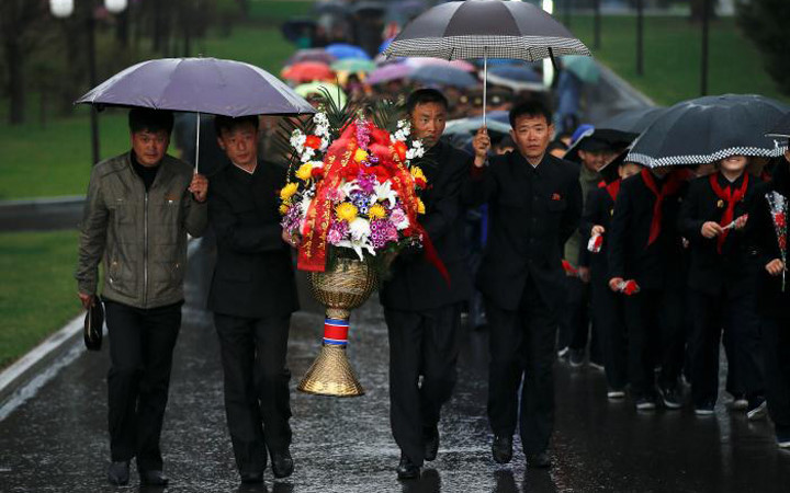 Hành động che ô cho lẵng hoa đủ thấy sự tôn kính của người dân Triều Tiên đối với 2 vị cố lãnh đạo.
