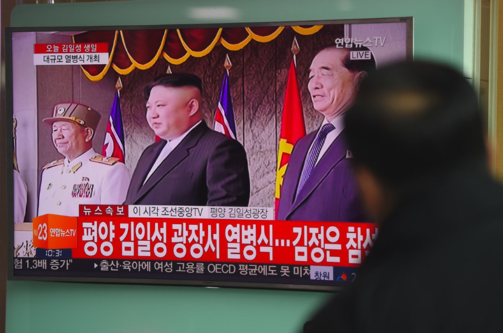 Một người dân Hàn Quốc chăm chú theo dõi nhà lãnh đạo Triều Tiên Kim Jong-un chủ trì lễ diễu binh tại quảng trường Kim Nhật Thành qua tivi công cộng tại một ga tàu điện ngầm ở Seoul.