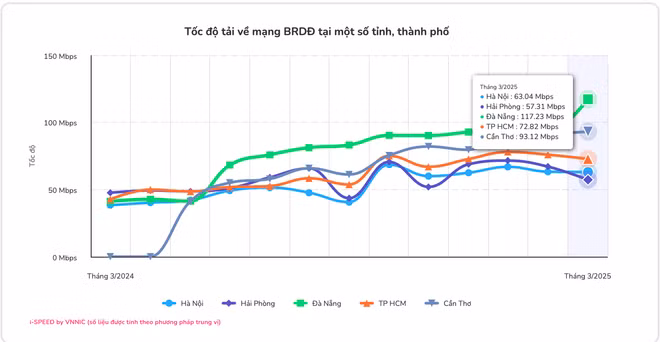 Tốc độ mạng băng rộng cố định cũng ghi nhận mức khả quan trong tháng 3/2025 khi tốc độ download trung bình cả nước là 109,8 Mbps, tốc độ upload 100,98 Mbps. Xét riêng 5 tỉnh thành phố lớn thì Hải Phòng là địa phương có tốc độ mạng nhanh nhất lên tới 251,96 Mbps, đây cũng là thành phố có tốc độ mạng băng rộng cố định tăng nhanh nhất kể từ đầu năm 2025. Kế đến là Hà Nội, Cần Thơ, Thành phố Hồ Chí Minh và Đà Nẵng.