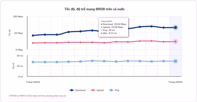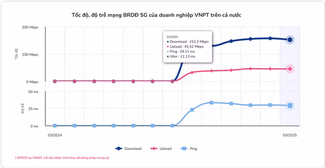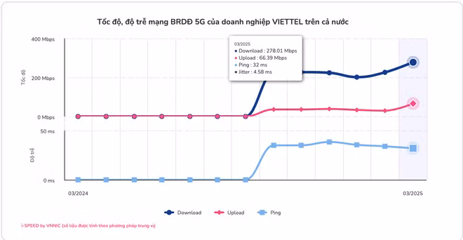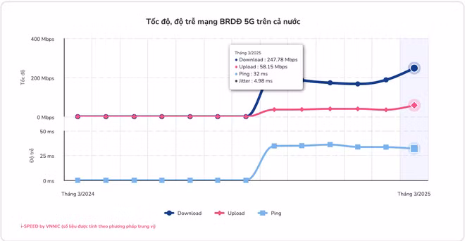Theo dữ liệu mới nhất từ nền tảng Internet i-Speed thuộc Trung tâm Internet Việt Nam – VNNIC (Bộ Khoa học và Công nghệ), tốc độ truy cập mạng 5G tại Việt Nam trong tháng 3 năm 2025 đã đạt mức cao nhất kể từ khi bắt đầu thương mại hoá. Đây được xem là một cột mốc đáng chú ý trong hành trình triển khai và thương mại hóa 5G tại Việt Nam.
