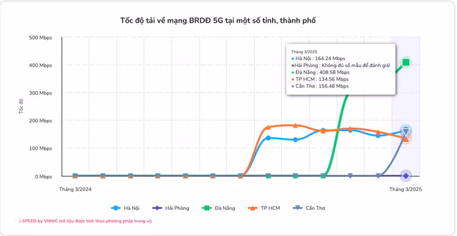 Trong tháng 3/2025, hệ thống i-Speed cũng ghi nhận tốc độ truy cập mạng băng rộng di động cải thiện đáng kể với tốc độ download 65,92 Mbps, upload 23,58 Mbps. Nhờ có mạng 5G tốc độ cao đã giúp Đà Nẵng giữ vững vị trí là địa phương có tốc độ truy cập mạng băng rộng di động cao nhất trong 5 tỉnh, thành phố trên cả nước trong nhiều tháng liền với tốc độ tải về lên tới 117,31 Mbps.