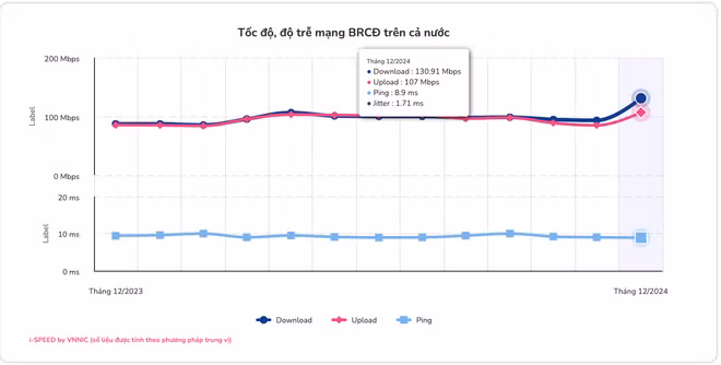 Hệ thống đo tốc độ truy cập Internet i-Speed do Trung tâm Internet Việt Nam (VNNIC) phát triển đã cập nhật số liệu chất lượng Internet trong tháng 12/2024. Đây là hệ thống giúp người dùng có thể chủ động lựa chọn điểm đo, thực hiện đo và tự đánh giá tốc độ truy cập Internet của mình theo các tiêu chuẩn và gói cước cung cấp bởi các nhà mạng.