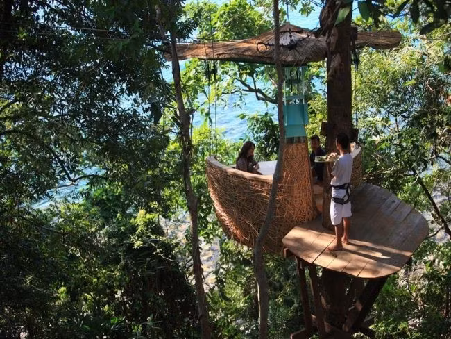 Treepod @ Soneva Kiri - Koh Kood, Thái Lan. Nhà hàng Treepod là nơi hoàn hảo cho thực khách không sợ độ cao. Họ sẽ được ăn trưa trong chòi thân thiện sinh thái treo lơ lửng giữa cây cối trong rừng, và đồ ăn được tiếp nhờ hệ thống đường dây.